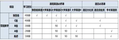 每个等级的学生按照以下图表中“√”规定的范围选课、修满对应学分。被分入免修级、A级、B级的学生,默认获得低于其级别的学分,并按90分计入其成绩单(详见图表)。