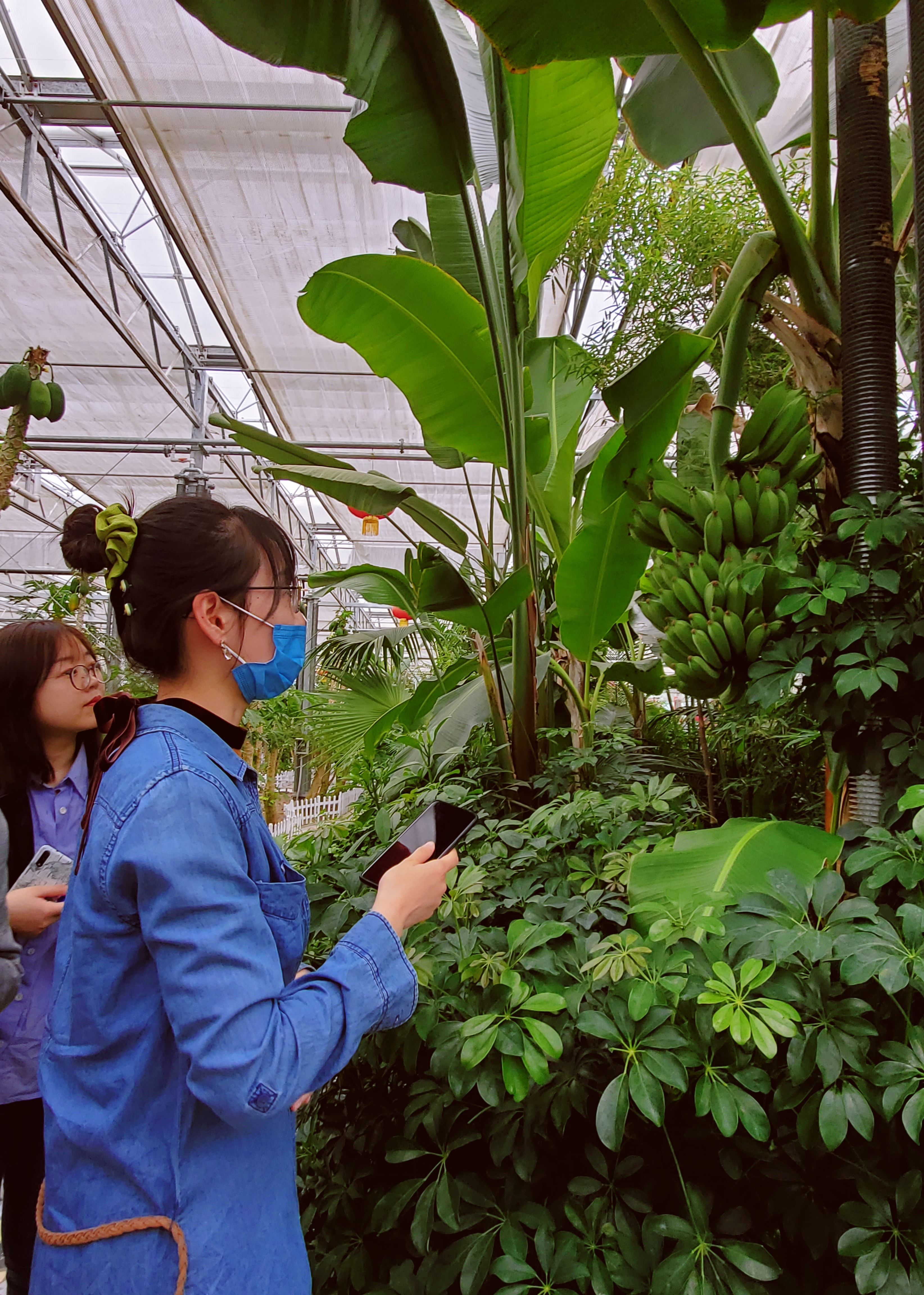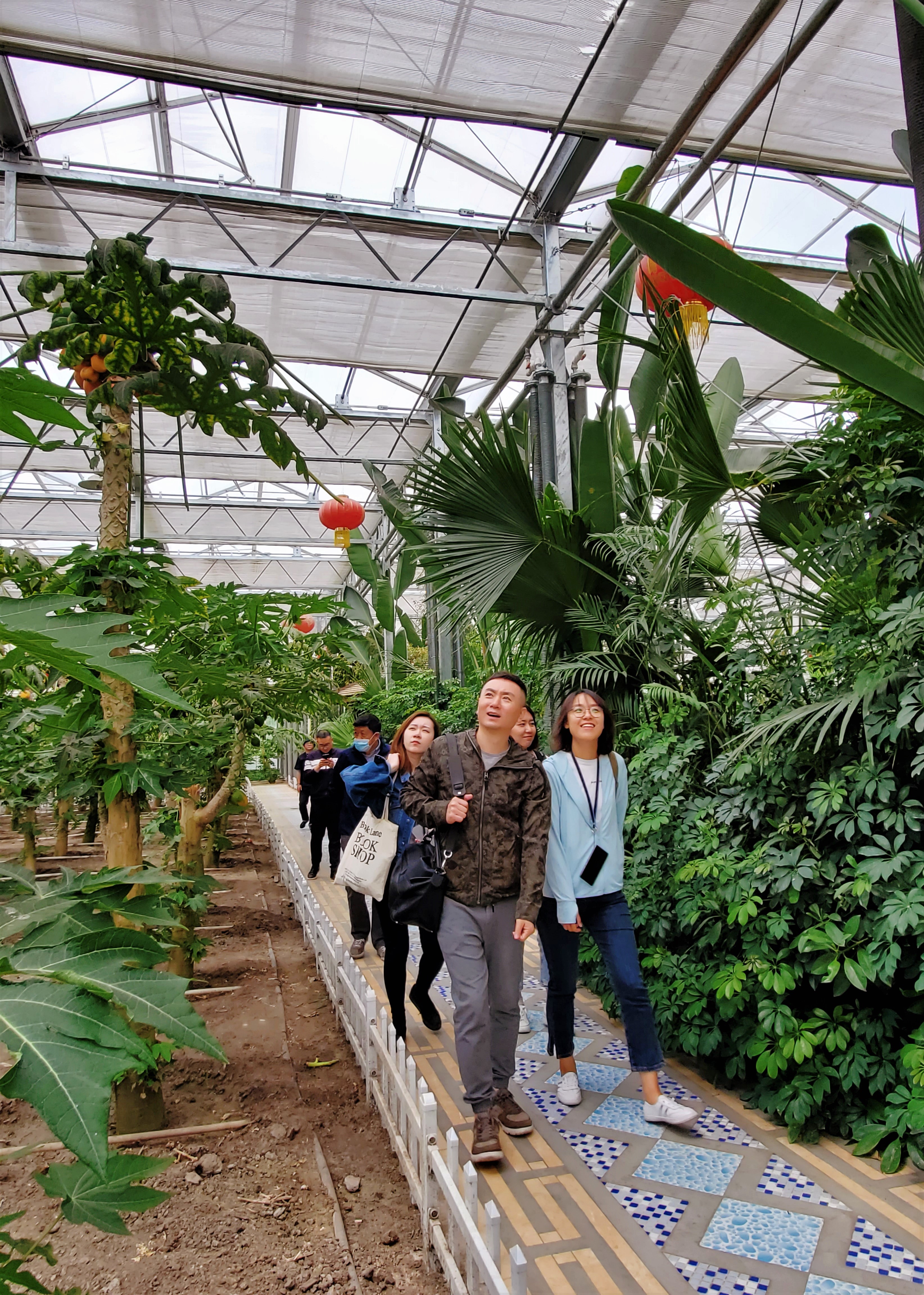现代农业展示馆包含公共服务区和智能温室两大部分。公共服务区主要是一中一大两个餐厅,适用于村民婚丧嫁娶集体聚会等活动,厨房为玻璃隔断,通透可视。智能温室总面积为10000平方米,以太阳能、浅层地热能等“蓄热保温”为能源,实现蔬菜冬季生产;引进“南果北栽”项目,应用“植物冷链唤醒还原技术”培育木瓜和香蕉苗1100株。师生们漫步在木瓜香蕉培植区,恍然置身于热带雨林。
