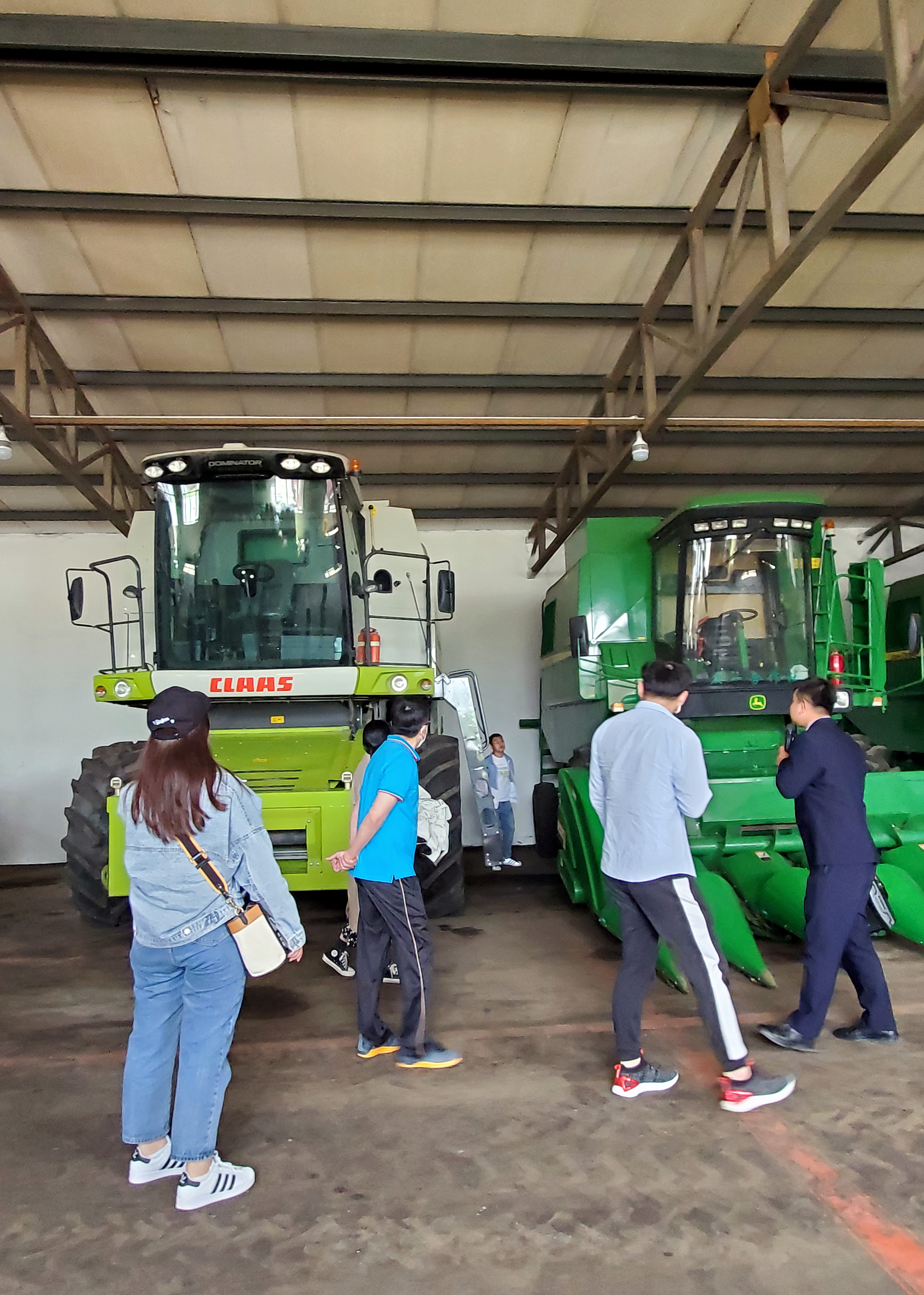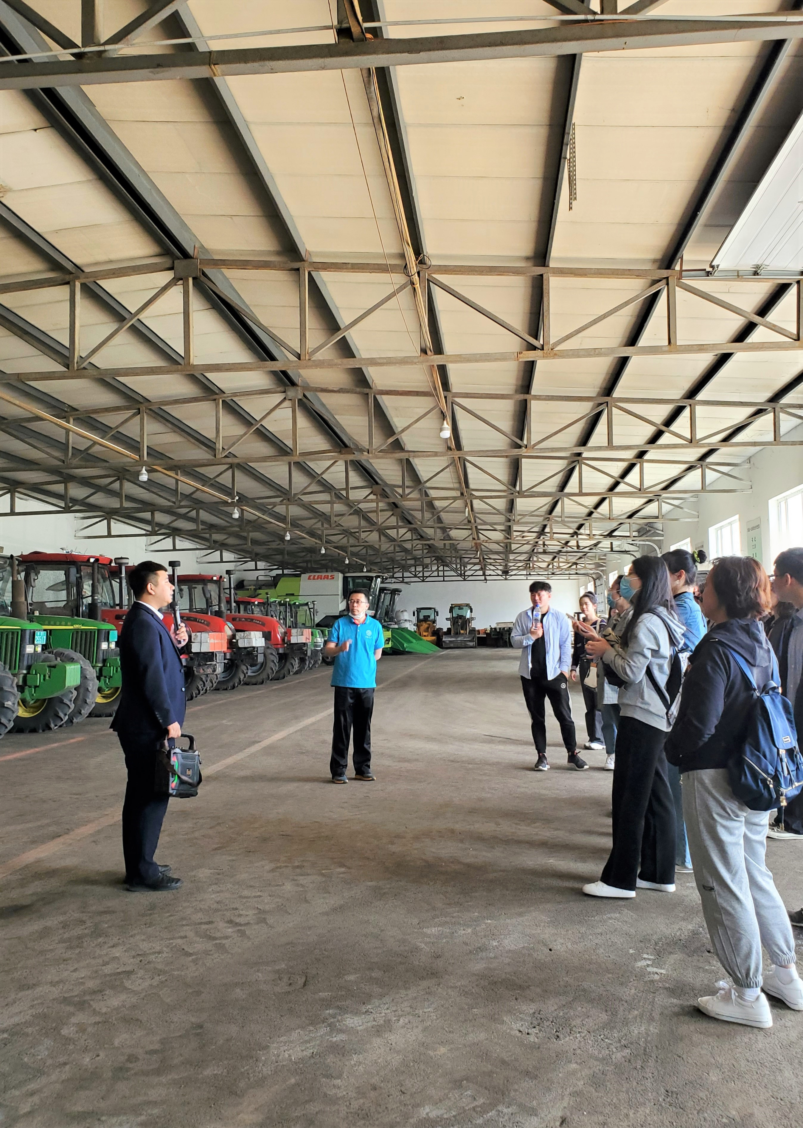 之后大家来到农业机械专业合作社。吕赵男向大家详细讲解了陈家店村的土地政策和推行的农业机械智能化项目。其中值得一提的是,农业机械专业合作社目前已有9台农业机械安装了远程视频监控系统,实现了大田精准作业、农机深松作业质量监测、激光平地、大型拖拉机作业控制、大型收获机械作业监测等技术作业远程视频监控。完善的农机作业服务开辟了一条行之有效的致富途径,对促进农民增收发挥了重要作用。参观人员站在巨大的农机前,现代化农村大集体耕作模式颠覆了他们已往对东北农业生产的认知。