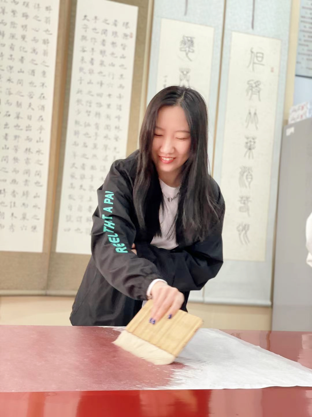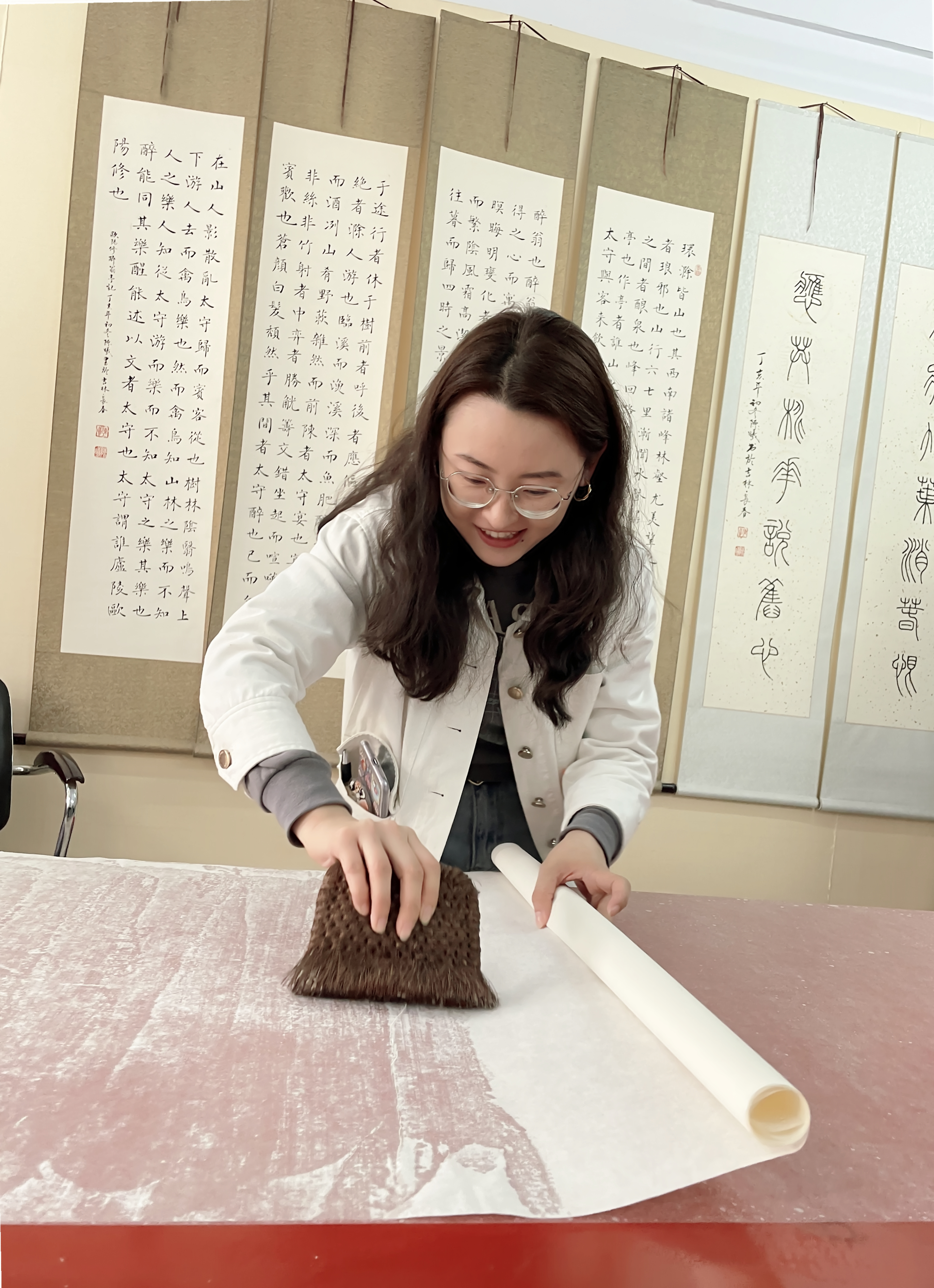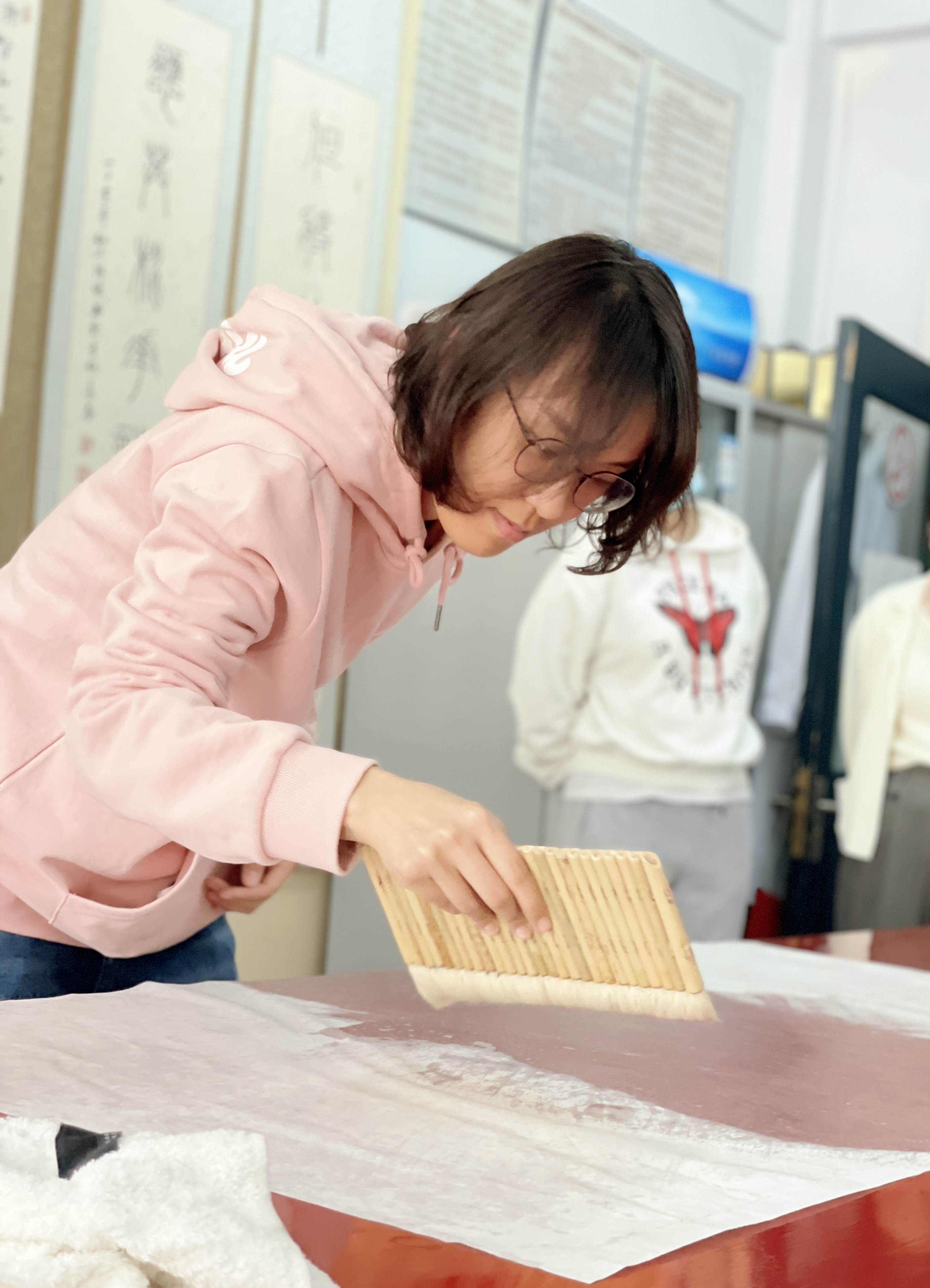 刷浆完成后,左手持略大于画心的托纸,右手持棕刷,对齐刷浆完毕的宣纸的右边,一边展卷,一边用棕刷上下快速排扫托纸,逐渐使整张托纸平整贴附于宣纸背面。这个过程中排除气孔和不留死褶仍然是最为重要的一项。