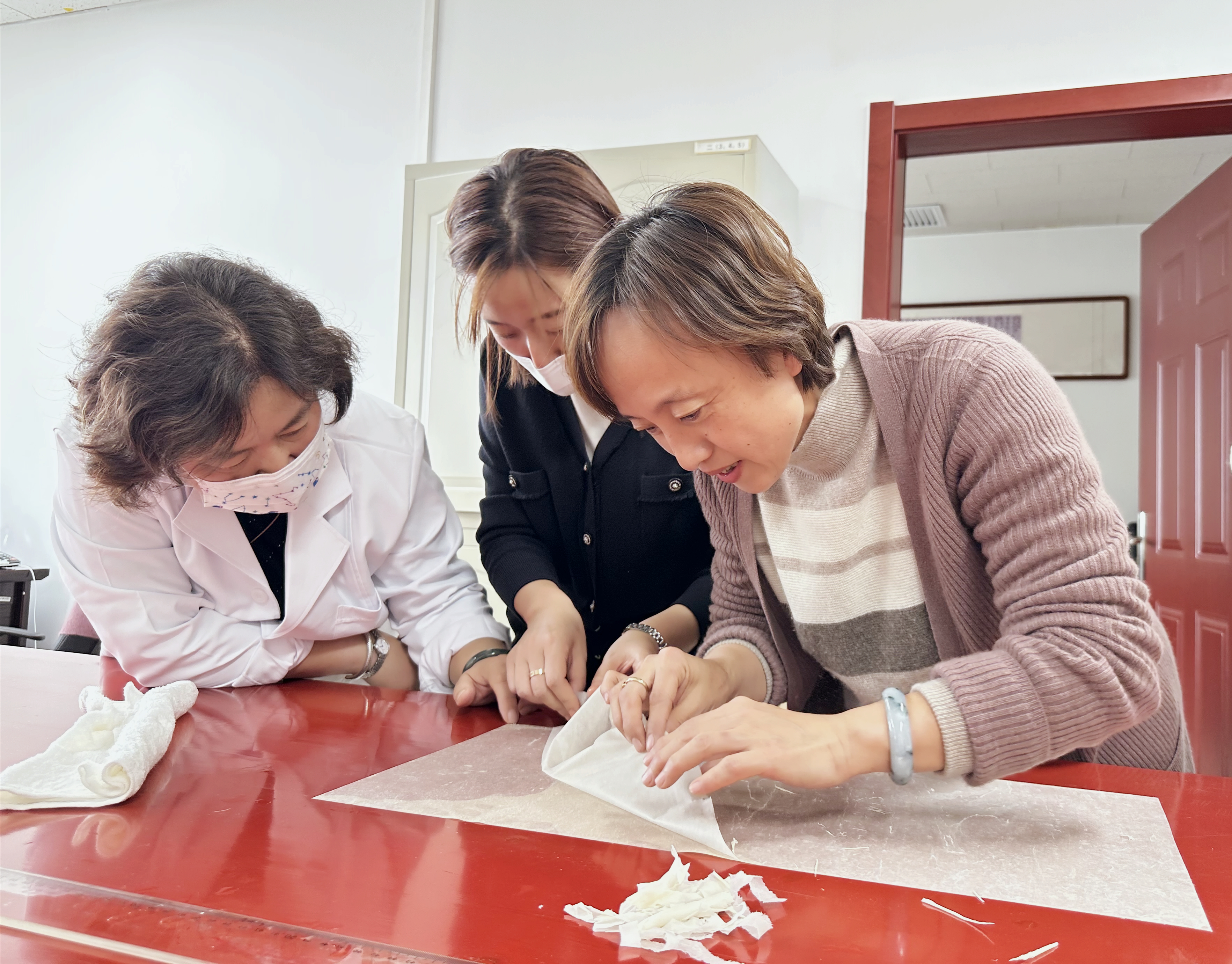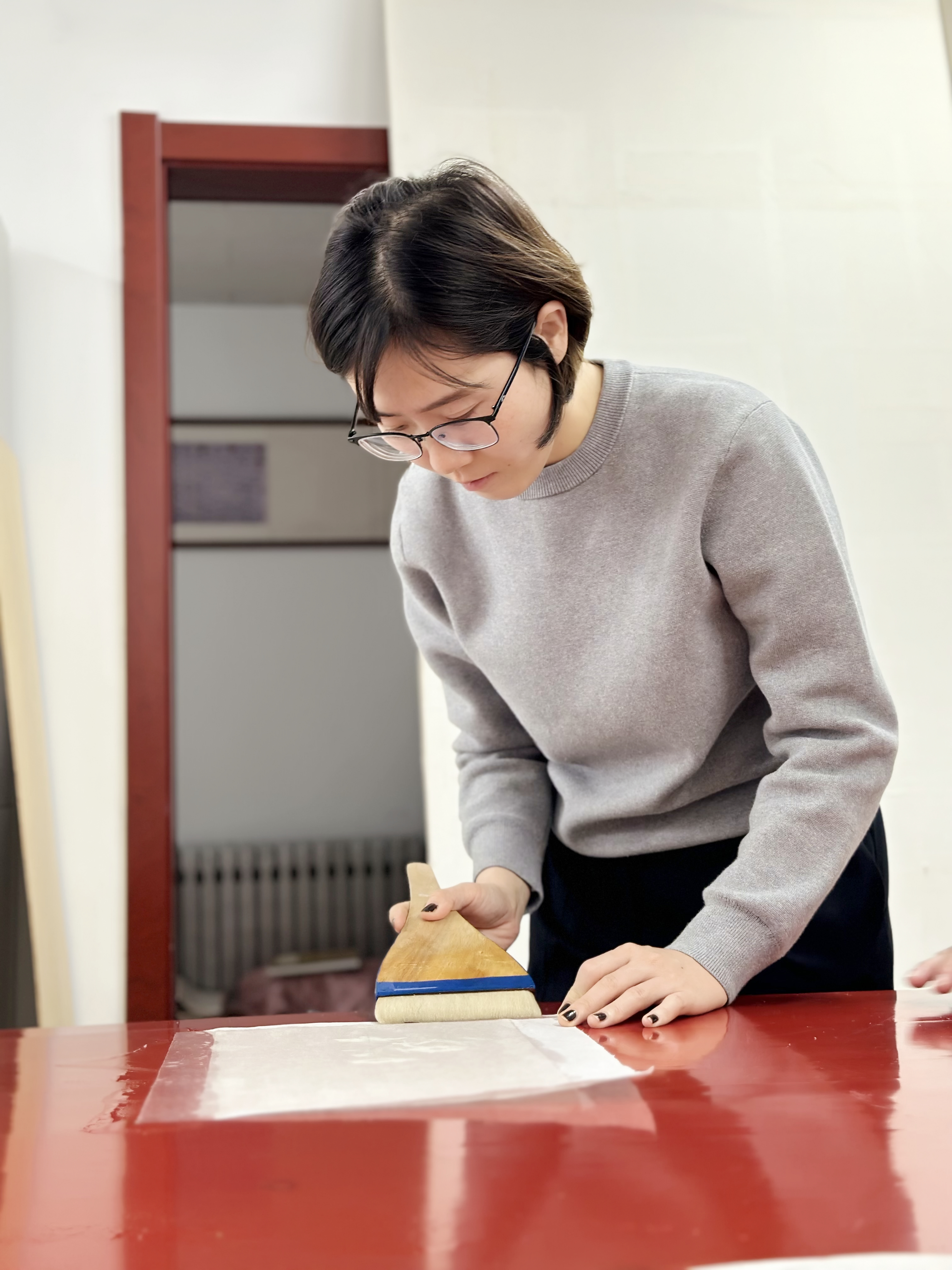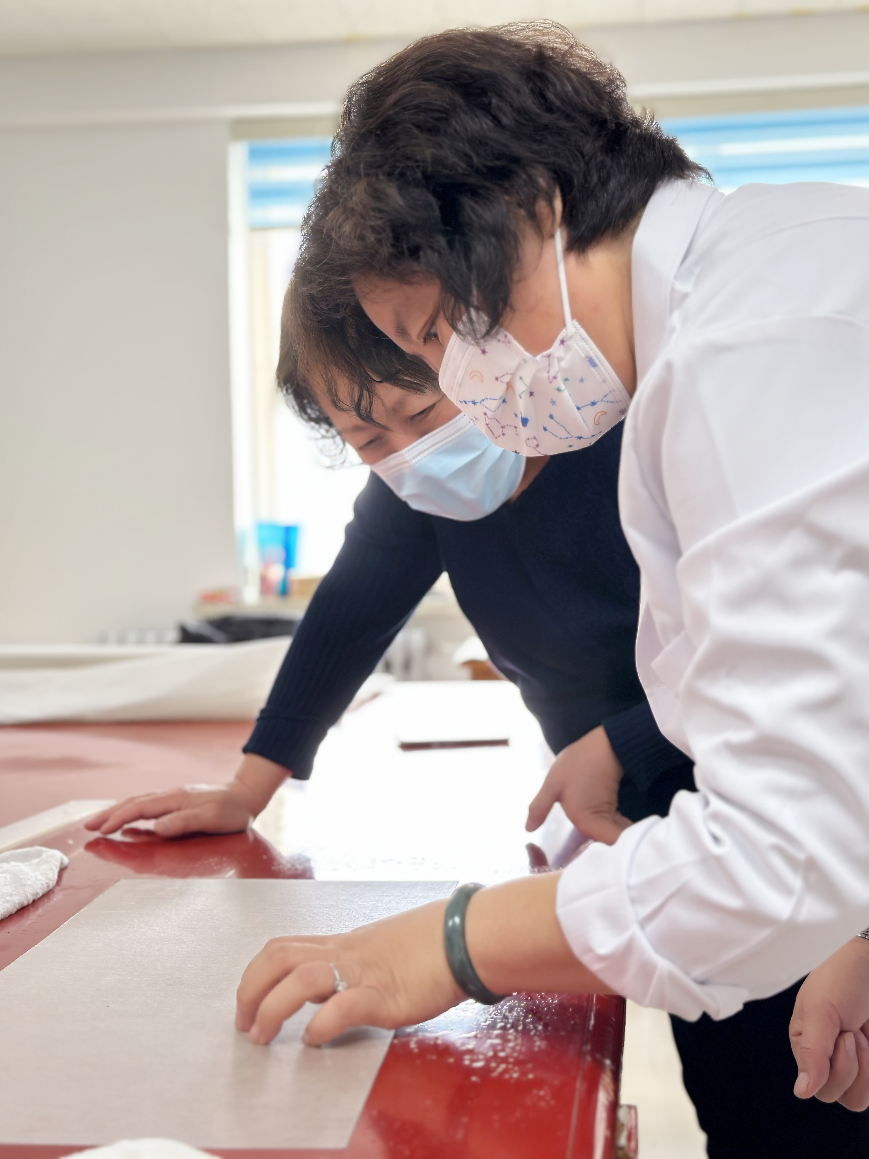 有的人在刷浆时出现褶皱惊慌失措手忙脚乱,有的人气定神闲有板有眼。姜晓东不时地指导纠错。围观的拍照摄像交流心得。第二天,看到完全晾干剪裁好后的花笺排放在装裱案上,老师们学习后的喜悦溢满心胸。