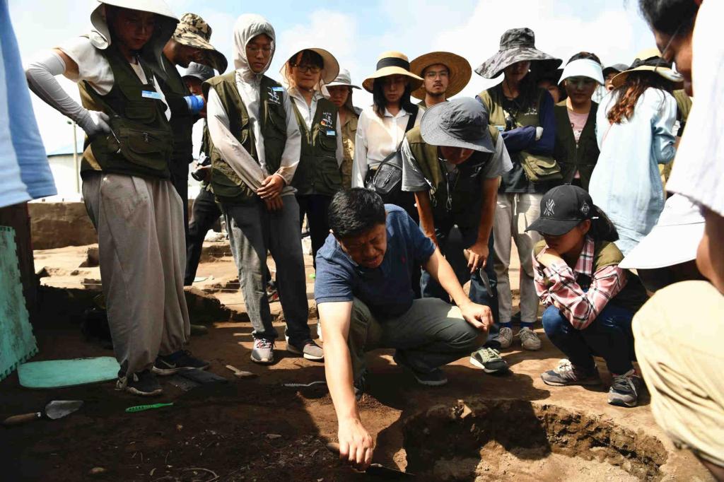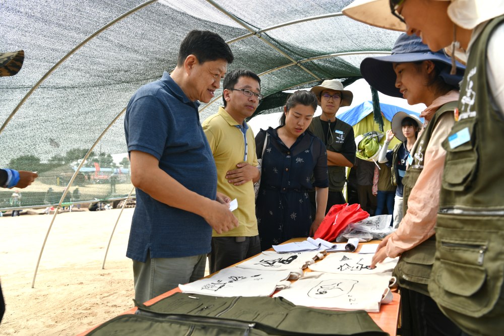 党政人员一行首先来到考古发掘现场,在领队方启老师和陈醉老师的带领下,先后检查了公众考古宣传展示区、监控室、装备室、保护棚、发掘区、系统采样浮选区、参观群众问卷调查区、文创产品展陈区等。在几个有代表性的探方中,领队老师和学生向赵院长汇报了挖掘进度、挖掘思考与感悟。赵宾福针对现场情况,向同学们提出问题,进行细致的现场业务指导,并与师生们分享自己的田野经验。