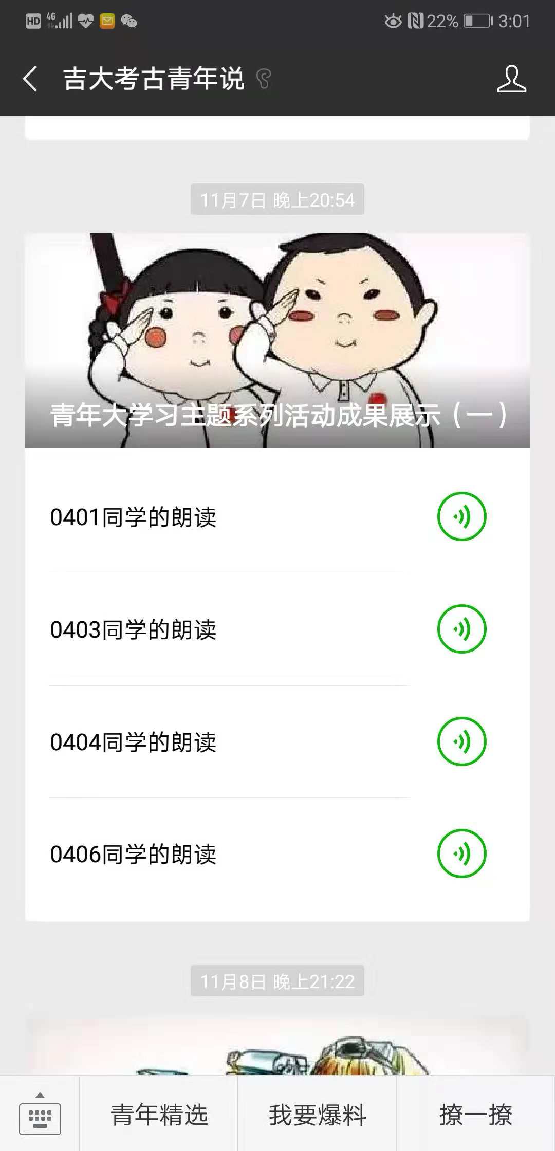 首先,本次推送中吉大考古青年说微信平台首先展示了霍奕然等四名同学的经典朗读音频。其中,我们聆听了极速飞艇