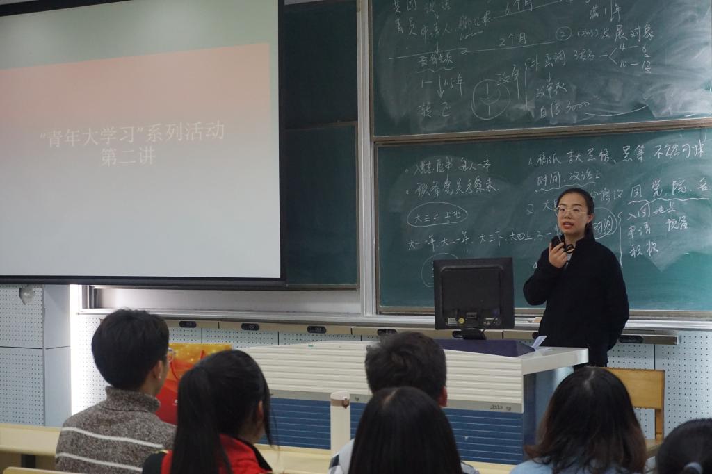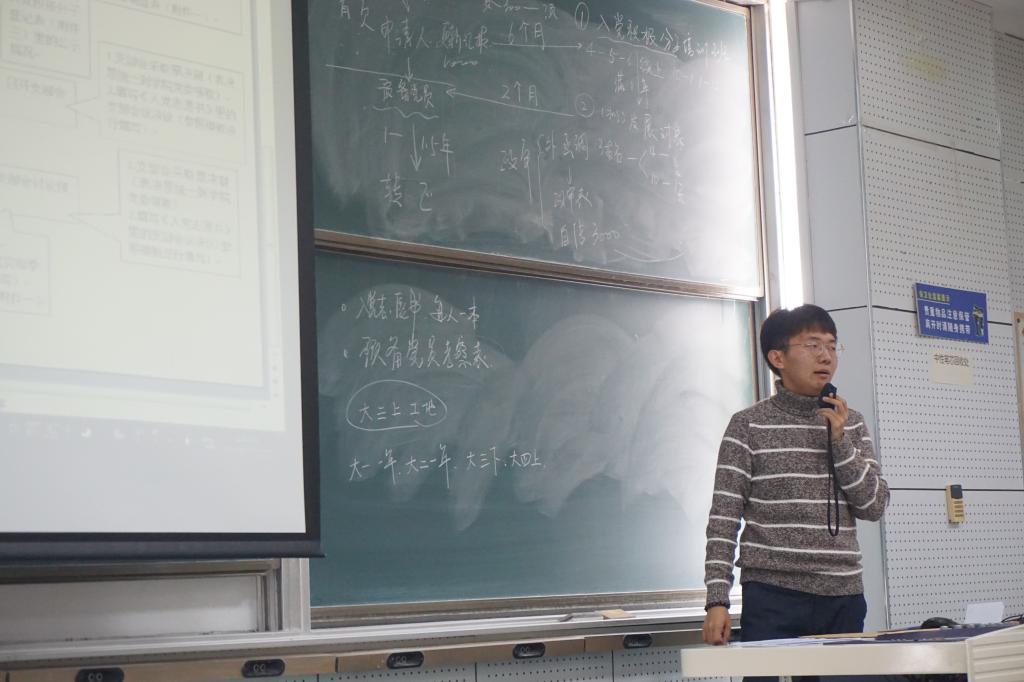 团委副书记,2016级新闻学专业曲昭琦学长为同学们讲解大学生入党的流程,以简洁明了的时间线为大家勾勒出从申请人到正式党员的流程及所需时间,并介绍了入党申请期间的各种所需资料与注意事项。最后,曲昭琦还耐心地为同学们解答了疑惑。