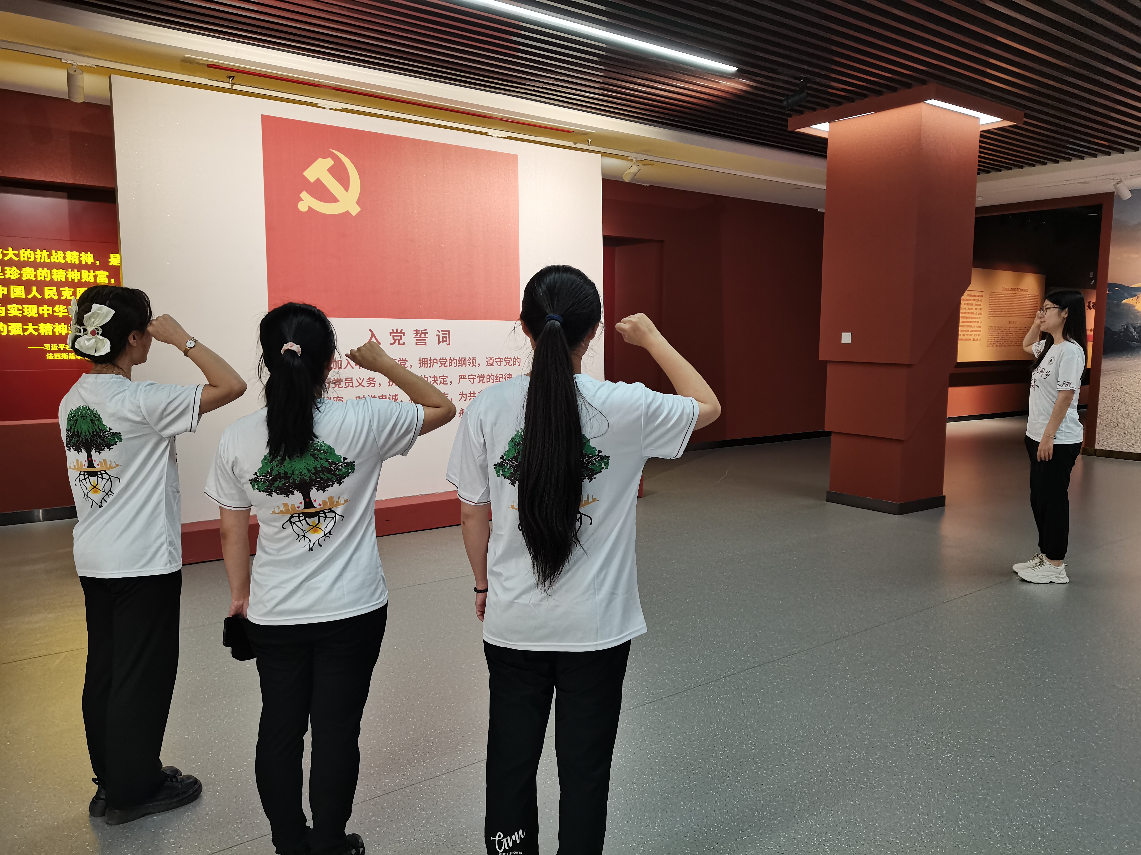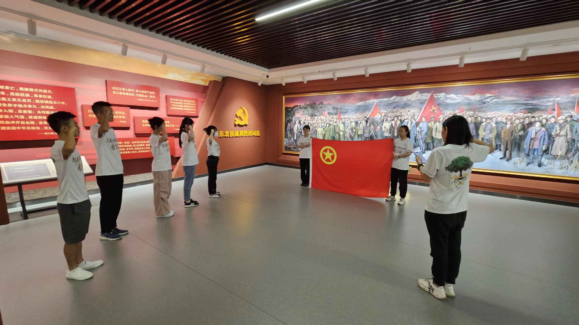 活动最后,团队成员面对鲜艳的党旗、团旗,庄严地举起右手,重温入党、入团誓词。百年岁月过去,记忆仍刻骨铭心。今天的中国青年当不忘国耻,传承抗日精神,满怀报国热忱,不负凌云之志,将青春与汗水奉献到建设祖国的伟大事业之中,走好我们这一代人的长征路。