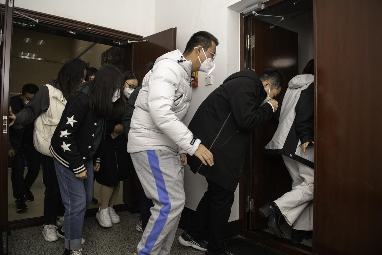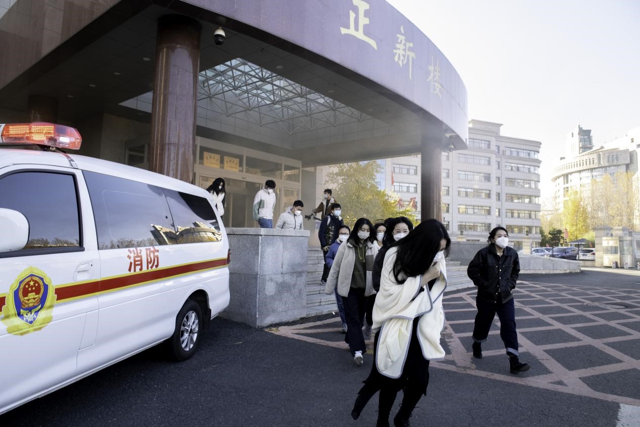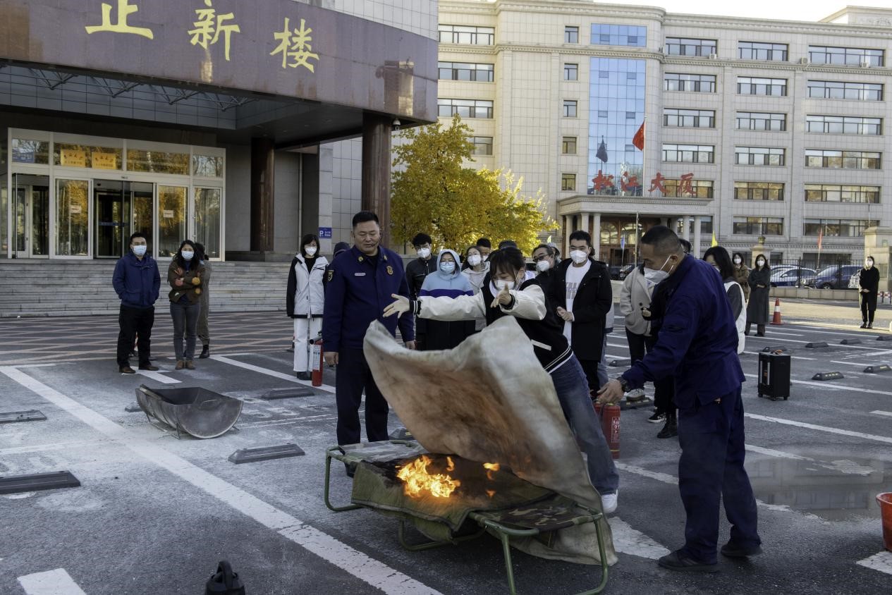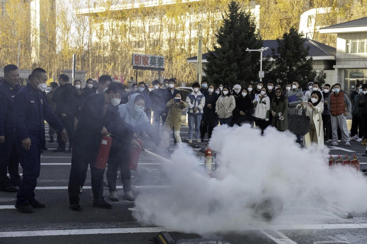 讲座结束后,全体参会人员在正新楼门前停车场进行了火灾应急疏散演练和消防器材灭火操作演练。首先,模拟正新楼突发火情产生大量浓烟,烟雾报警器响起,参加演练人员迅速、有序地撤离到安全地点。随后,所有参加演练人员分组进行各类消防器材灭火演练,指导师生在火灾初期正确运用灭火器、灭火毯进行扑救。