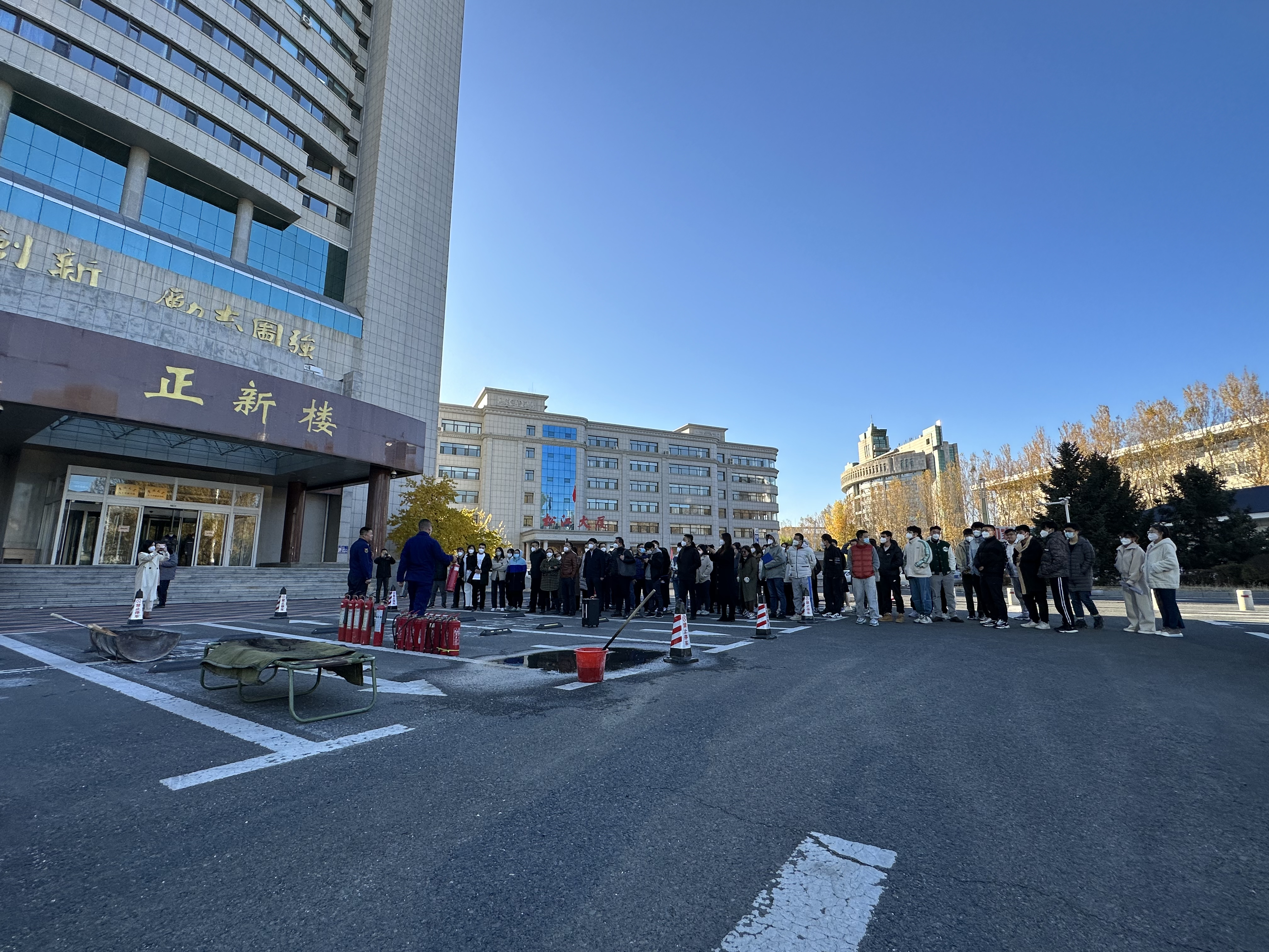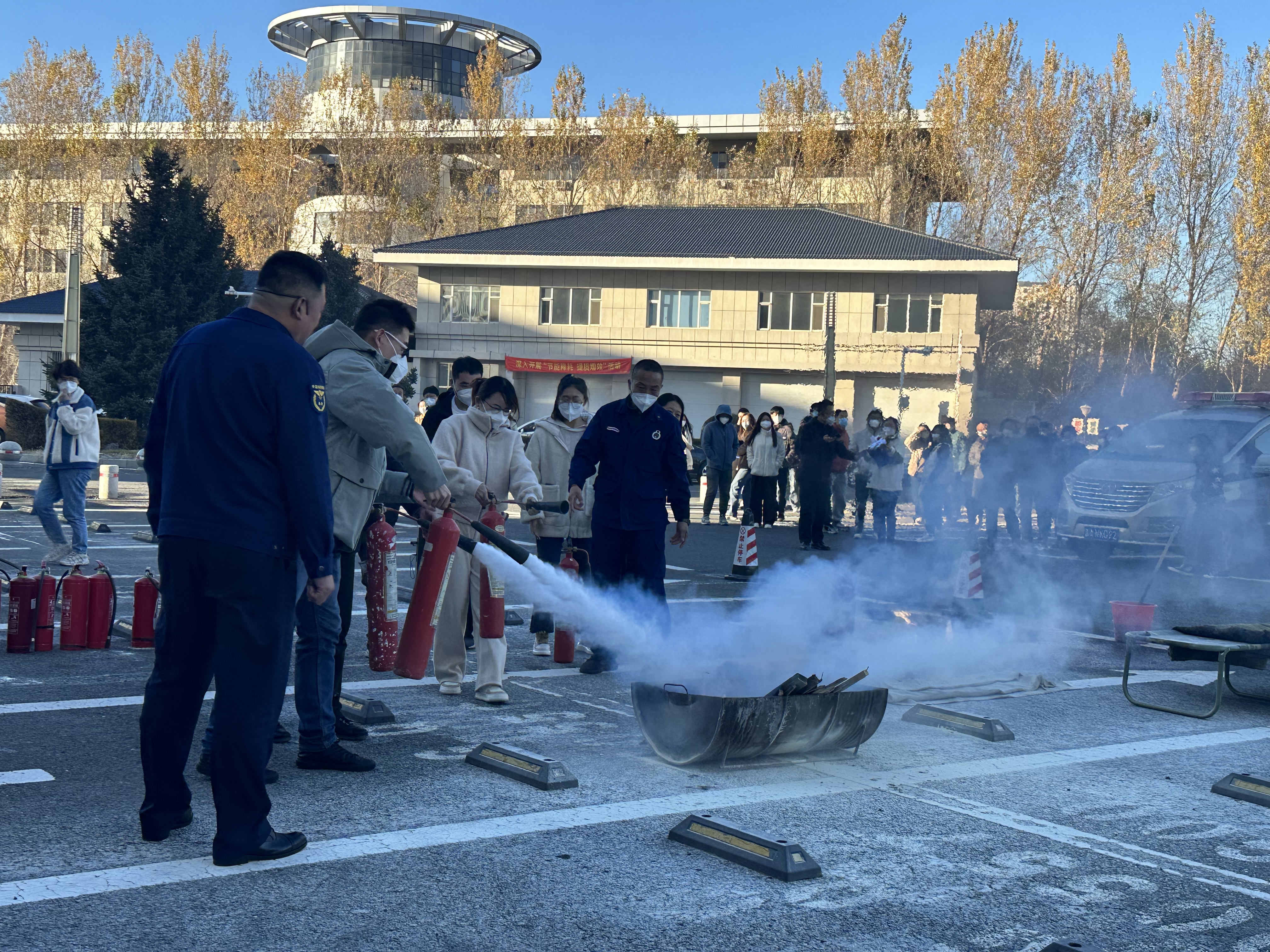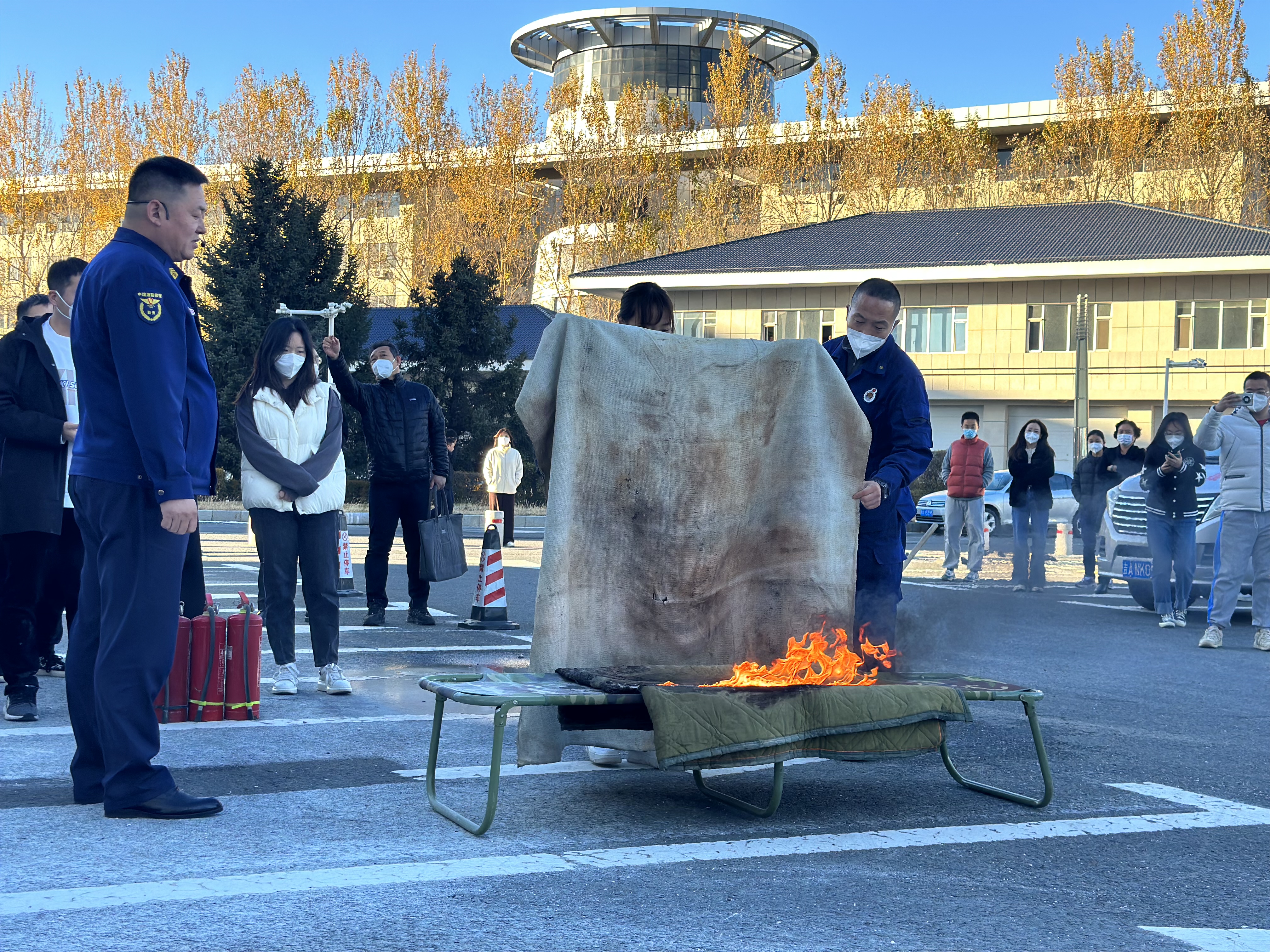 在正新楼门前开展了火灾疏散逃生演练。保卫处在正新楼门前燃放了烟雾弹,随后警报响起,在消防广播的提示下,全体师生迅速从安全出口疏散撤离。全部人员撤离到安全区域后,在正新楼门前空地设置模拟火情,董立明为大家讲解了二氧化碳灭火器、干粉灭火器、灭火毯的使用方法及注意事项,并指导师生对初期火灾进行扑救。