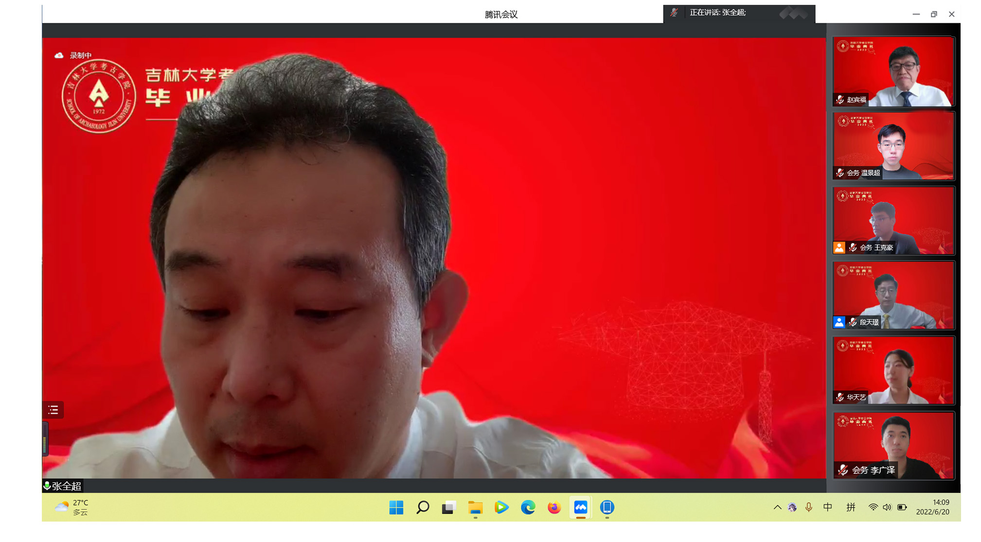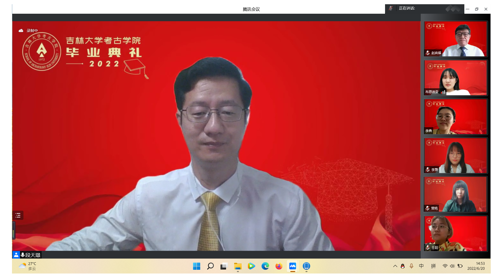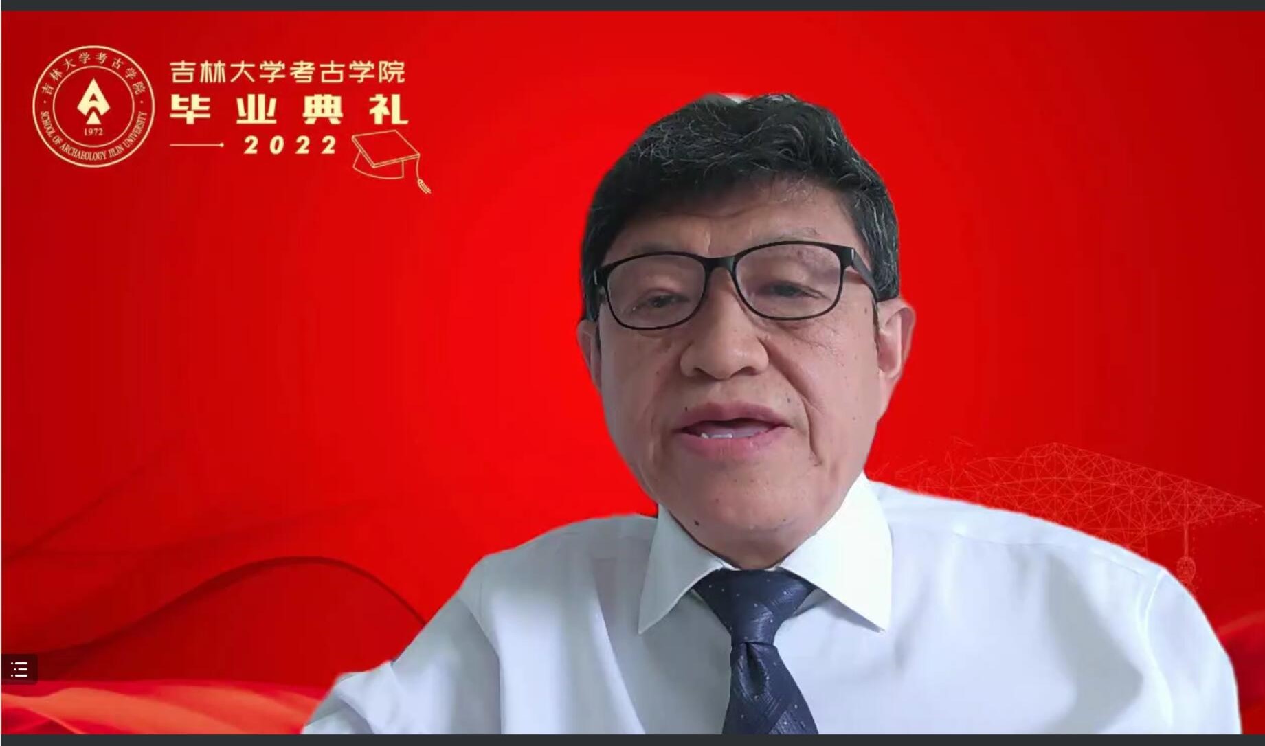 院长赵宾福教授致“直面挑战,勇毅前行”主题欢送词。他对2022届毕业生顺利完成学业表示衷心的祝贺,对辛勤付出的老师和家长表达了崇高的敬意。他指出,在当今世界处于百年未有之大变局和新冠肺炎疫情冲击下,当代青年要顺时而变,善于抓住机遇,直面人生挑战。为此,他与全体毕业生分享了三点感悟:一是希望吉大考古青年要牢记初心使命,永葆进取之心,为国家和民族发展贡献才智;二是希望吉大考古青年要锤炼品质,磨砺心志,塑造强大的内心世界,直面不同的人生挑战;三是希望吉大考古青年要锲而不舍,久久为功,脚踏实地。最后,赵院长鼓励同学们要以民族复兴为己任,在不同的岗位上开创自己的精彩人生,书写不负人民、不负时代的青春答卷。