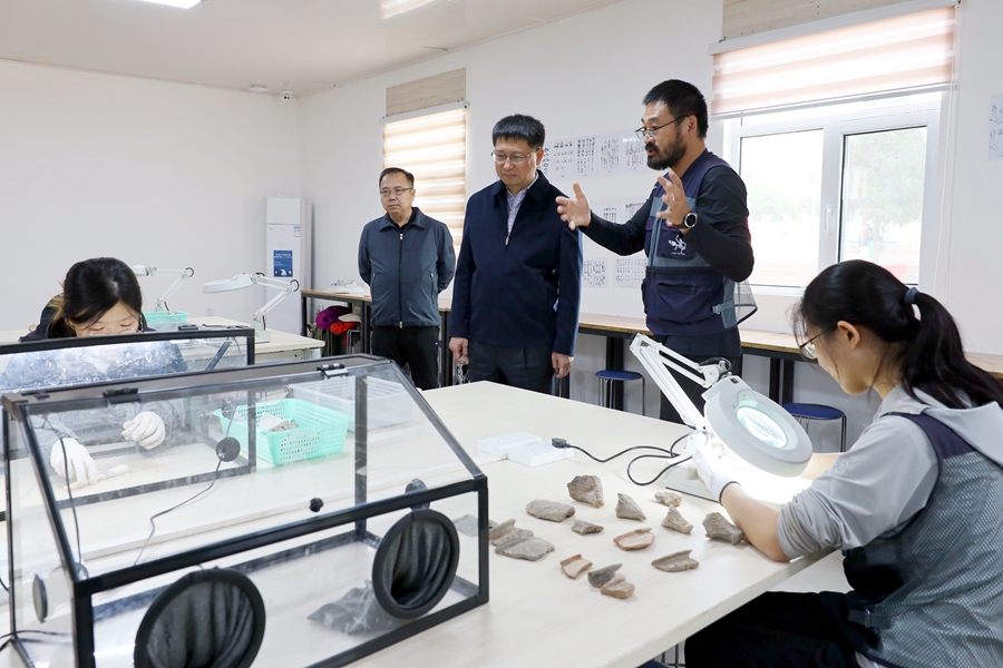 在考古工作站,张希进一步考察了师生日常工作情况,走进田野考古现场教室、文物医院、资料室、装备室等处,了解文物整理和登记规程,检看同学们的考古工作记录,对极速飞艇