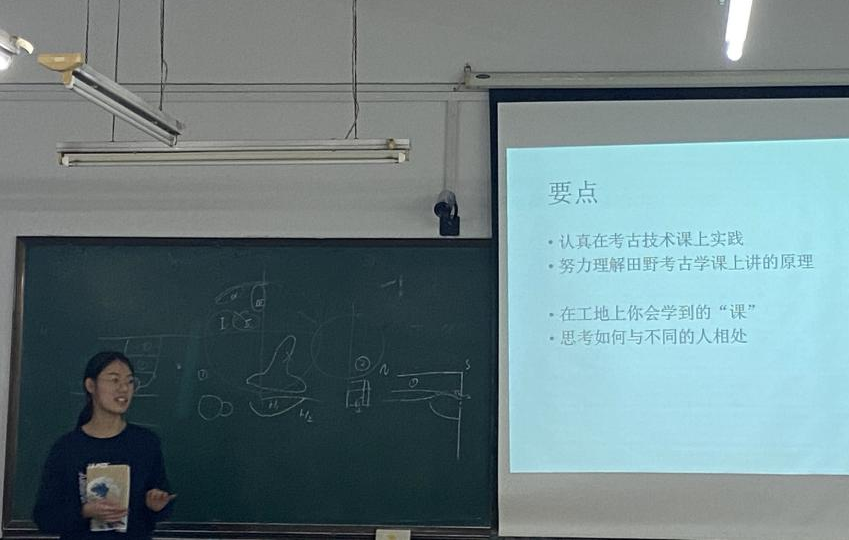 徐子姣同学和于永越同学提到了田野发掘中不同环节的重要性。徐子姣同学以工地日常生活小提示为引,分别向同学们介绍了实习基地的日常生活和工作内容,提到写好探方日记、及时整理数据的重要性。于永越同学讲到,要善于与民工交流并合理安排民工工作,提高发掘效率。他还建议同学们要及时完成每一阶段的记录和整理工作,不要将全部工作任务推至室内整理阶段进行。