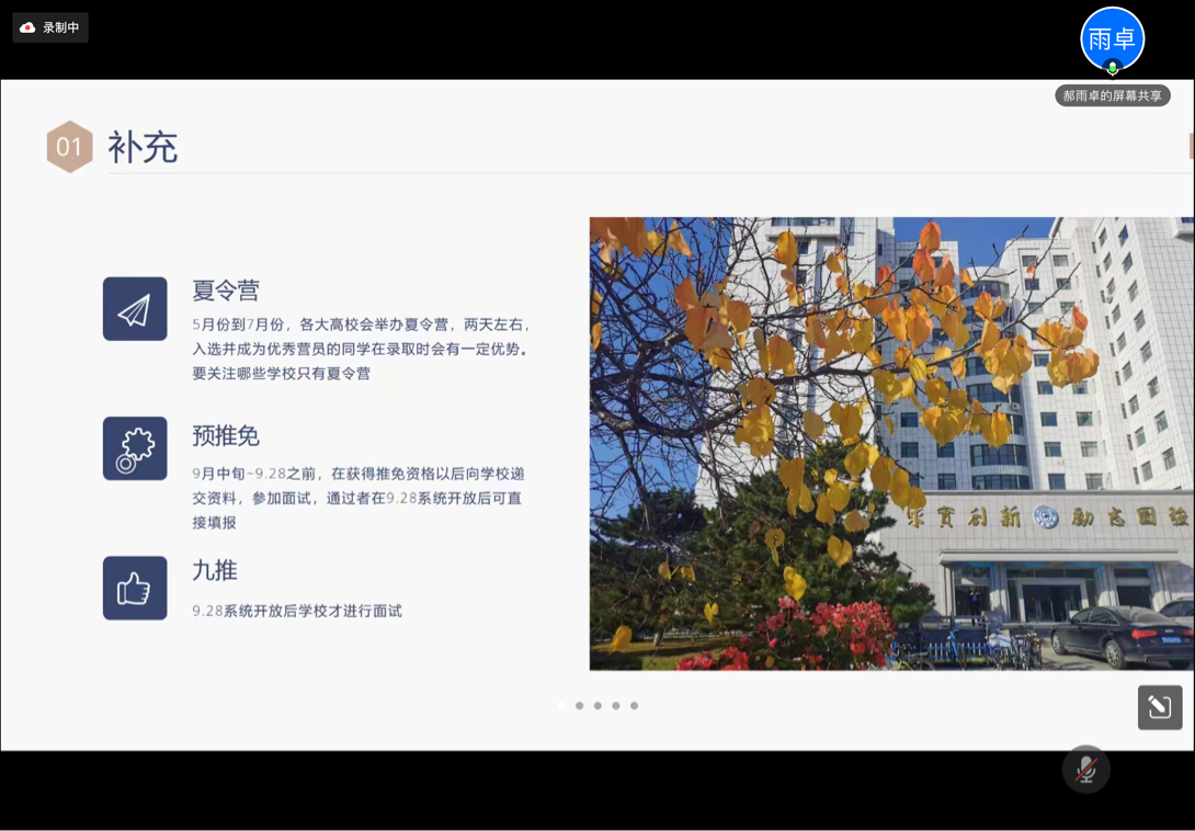 最后一位分享人是保研至复旦大学的焦越涵。她告诉大家要及时进行面试总结,根据需要对自己准备的内容进行补充。她还针对面试出题角度进行了详细讲解,提醒大家要充分了解自己提交的资料。最后,她也勉励大家,良好的心态和充分的准备是很重要的,不论结果如何都是最好的安排。