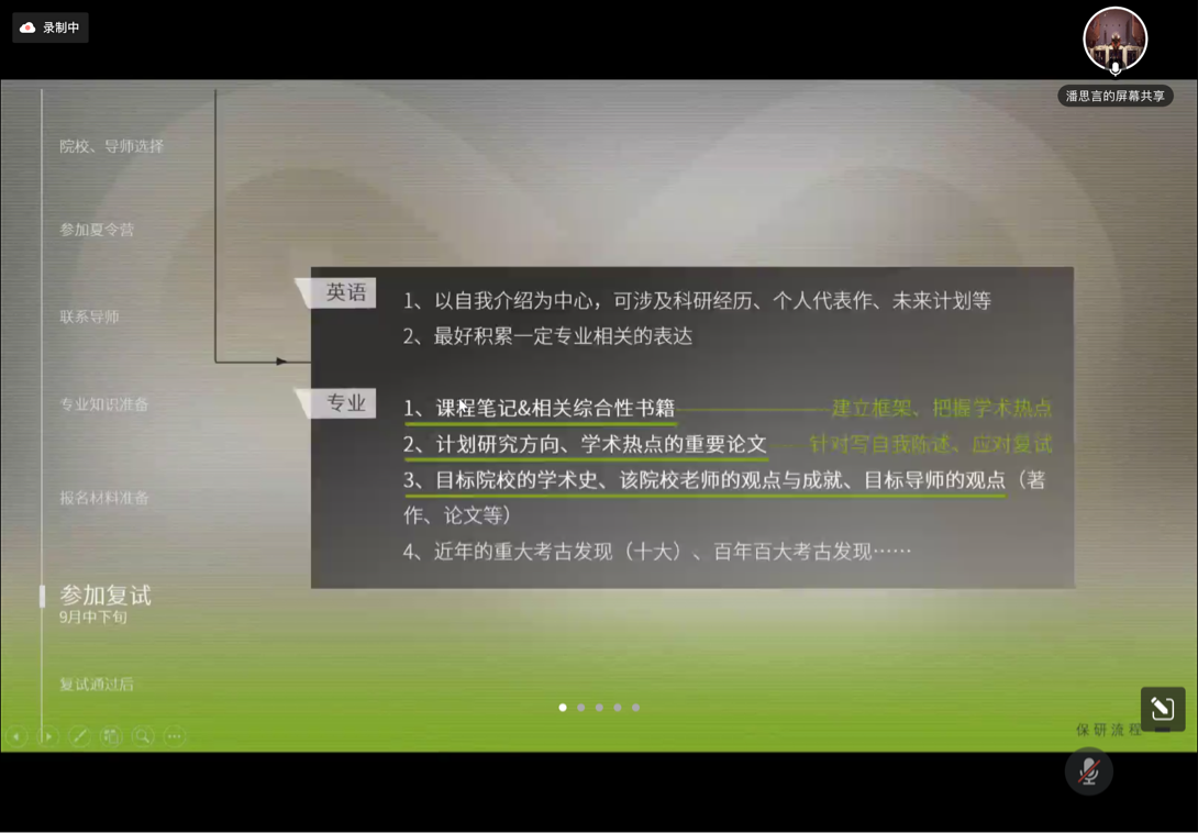 白沙平同学为大家带来她保研至北京大学的经验分享。她重点就保送至北京大学的保研前的准备工作以及笔试面试准备进行了回顾。她指出在备考过程中要密切关注近年的“十大考古发现”以及“百年百大”等热点问题。在院校的选择上,白同学提供了传统强势院系、专业方向和导师选择三个关注点,并为大家提供了一些了解信息的重要渠道。