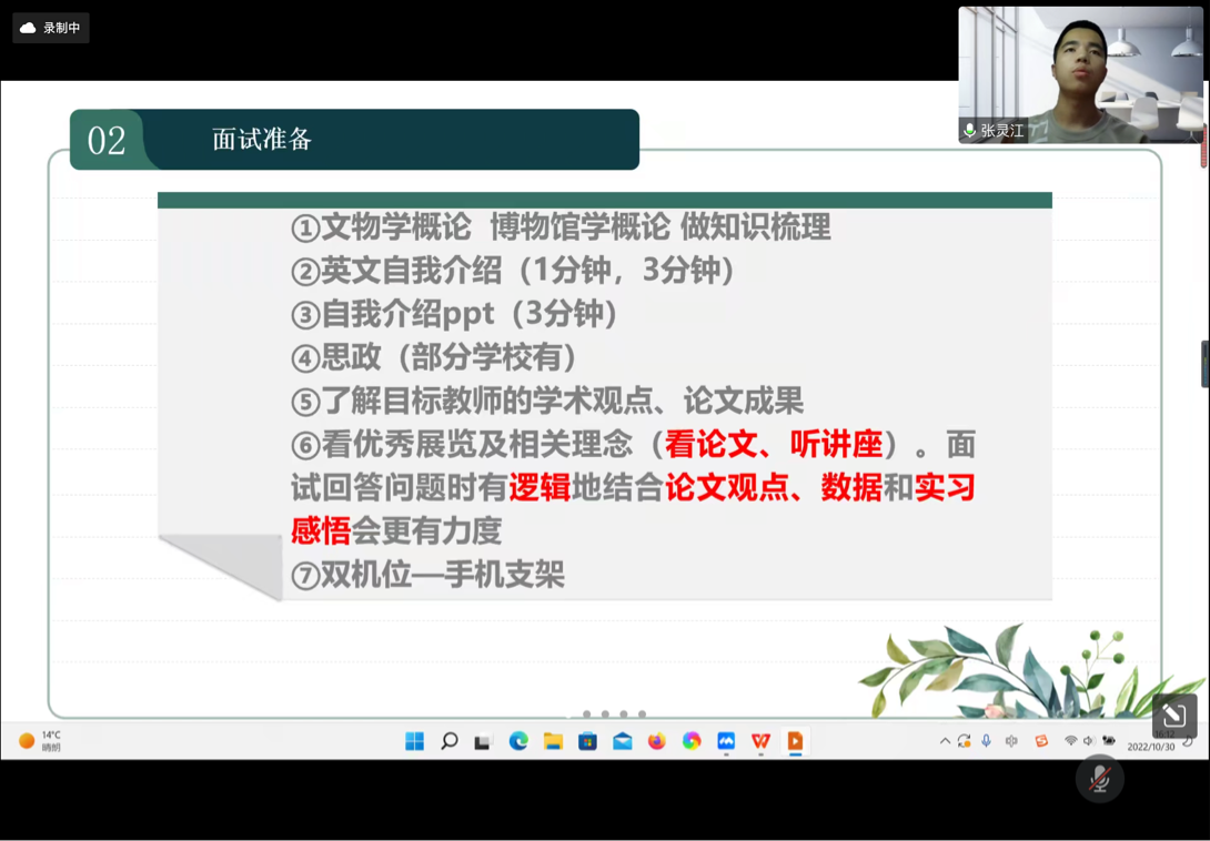 具体要求的介绍。针对文博专业面试中的专业课提问,他将需要的工作分成两部分,一部分是“早准备、少而精”的有关基础能力的内容,另一部分是“就近准备、多了解”的一些拓展内容,系统分析了需要准备的主要材料。