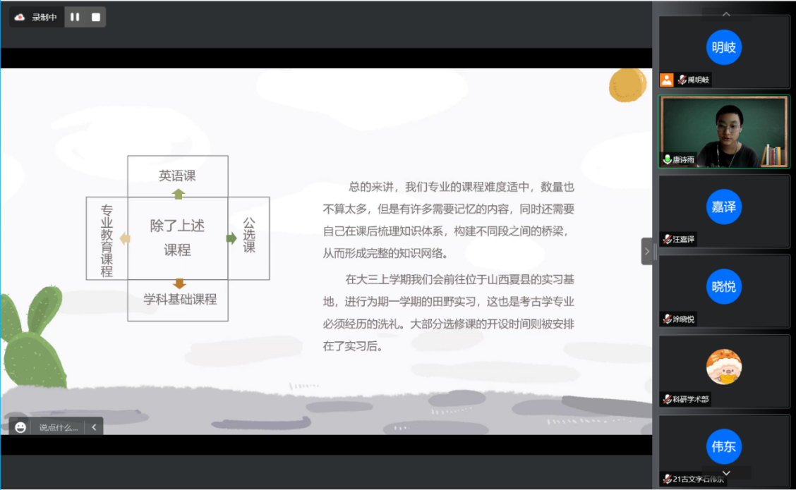 学生会汪嘉译同学主持,21级考古班唐诗雨同学,21级文博班郭晓同学和21级古文字班石伟东同学进行了分享。