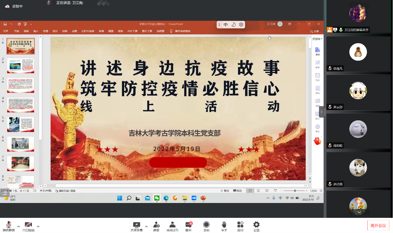 本科生党支部组织入党积极分子开展了“讲述抗疫故事,筑牢防控疫情必胜信念”线上主题党日活动。活动由2020级考古班团支书卫江南主持,极速飞艇