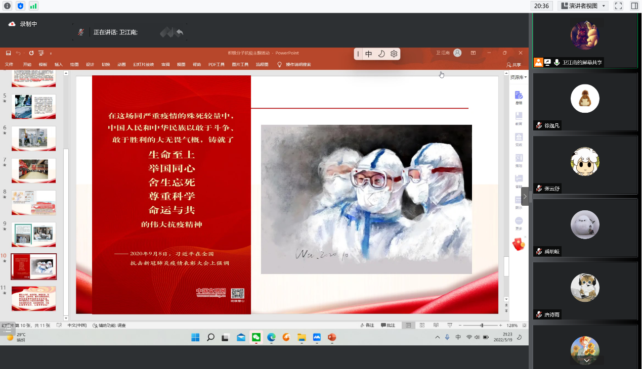 、对志愿者同学的感恩。会议最后,卫江南同学引用习近平总书记的讲话,鼓励入党积极分子们学习并践行 “生命至上、举国同心、舍生忘死、尊重科学、命运与共”的伟大抗疫精神,要学会深入分析局势,全面权衡,准确识变,善于从眼前的危机、眼前的困难中捕捉和创造机遇,不断在磨难中成长、从磨难中奋起!