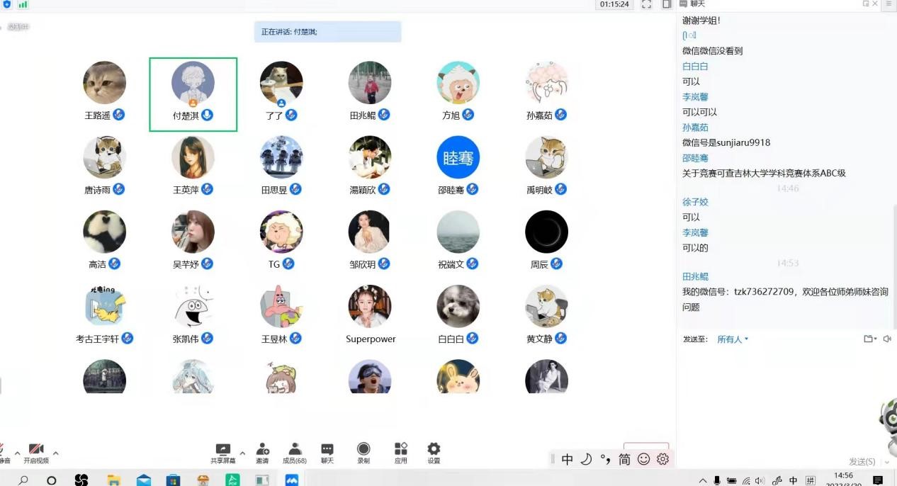 大学的王英萍和保研至上海大学攻读文博专硕的周辰雨作了分享。王英萍介绍了保研的时间表,分享了复试的心得体会,她建议同学们要多搜集有关保研院校、导师与研究方向相关的信息,做好充分的信息准备。备考中要密切关注近年的十大考古新发现、百年百大等热点问题。周辰雨重点向同学们介绍了参加夏令营的经历。她指出,夏令营的时间一般是在六月,参加夏令营需要一些准备材料,例如成绩证明、科研与大创项目、英语成绩等。随后她分享了自己在大创中的体会,并对同学们的疑问做出了解答。