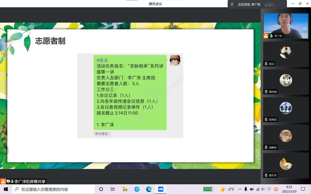 特色活动等想法。随后,公布了“志愿者制”这一创新性分工合作制度,以期较好地培养锻炼学生会成员综合能力,激发大家工作的积极性。最后,向全体成员阐明了专业学习的重要性,学习是大学生的第一要务,学生会成员要平衡好工学矛盾,在认真学习专业知识的基础上,更好地开展各项学生工作,从而建设更具先进性、引领性的学生组织。