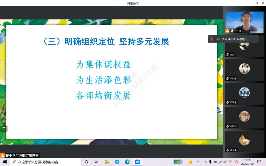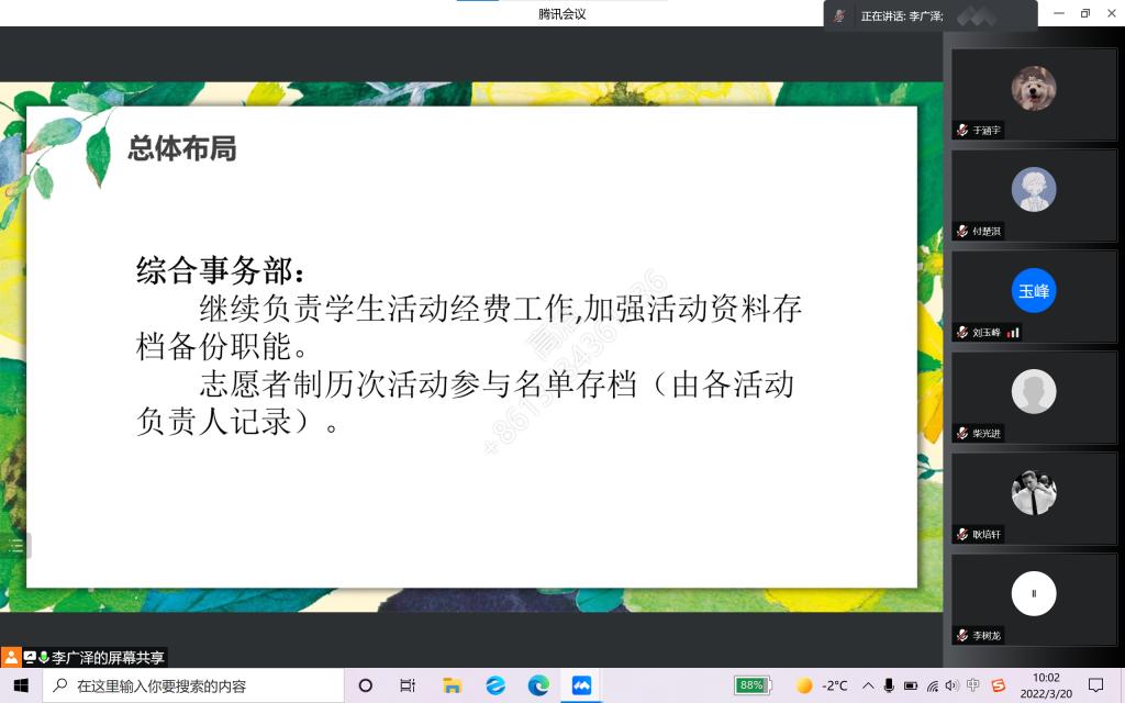 接着,从学生会主席团开始,各部门负责人纷纷对新学期部门工作的总体布局加以介绍与展望,并表示尽快制定适应当今疫情严峻形势下的各项活动方案,积极将线下工作转向线上,为同学们打造更多优质服务与活动。最后,李广泽清晰展望了未来学生会的发展方向,他希望学生会全体成员能够明确发展现状,积极探索和学习,加强改革创新,丰富学术探讨,打造极速飞艇