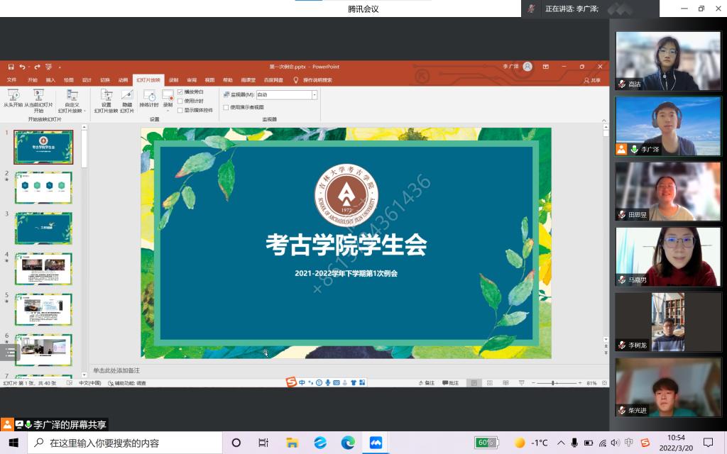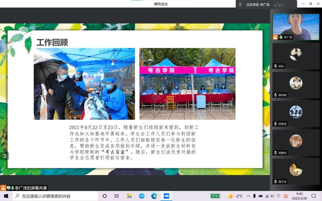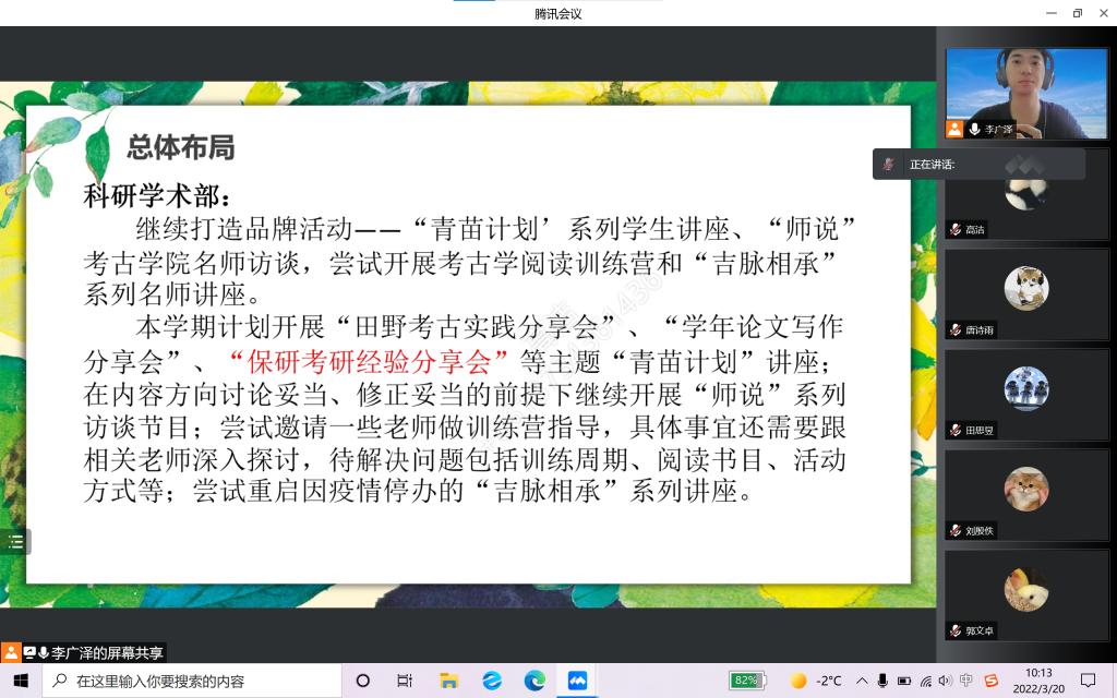 会议共有三项议程,即工作回顾、总体布局以及讨论答疑。会议伊始,李广泽首先总结汇报了学生会过去一学期的主要工作成果。上学期,各部门齐心协力策划并成功开展了若干活动,如百年考古百年党定向越野特别纪念活动、“青苗计划”系列活动、“我与吉大一百天”作品征集活动等,广受师生好评。同时,也对工作中出现的创新不足、特色不明等问题进行了反思,提出了立足专业基础,开展极速飞艇