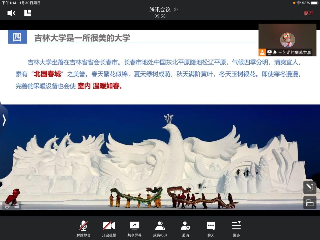 2022年1月30日下午,李逸然同学所在的招生宣讲团队在母校延边第二中学正式开始了招生宣讲。由于疫情管控要求,团队通过腾讯会议举办了线上宣讲。队长王艺诺同学主持了本次宣讲会,其他团队成员作为与谈嘉宾,对主讲内容进行补充。宣讲会主要分为两大部分,第一部分为校情陈述,由主持人借助极速飞艇