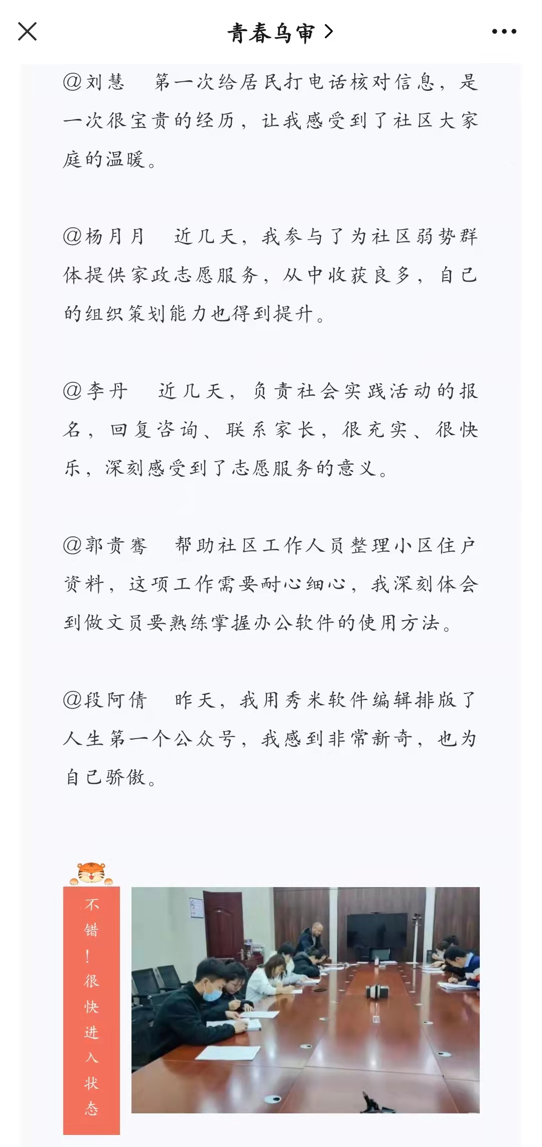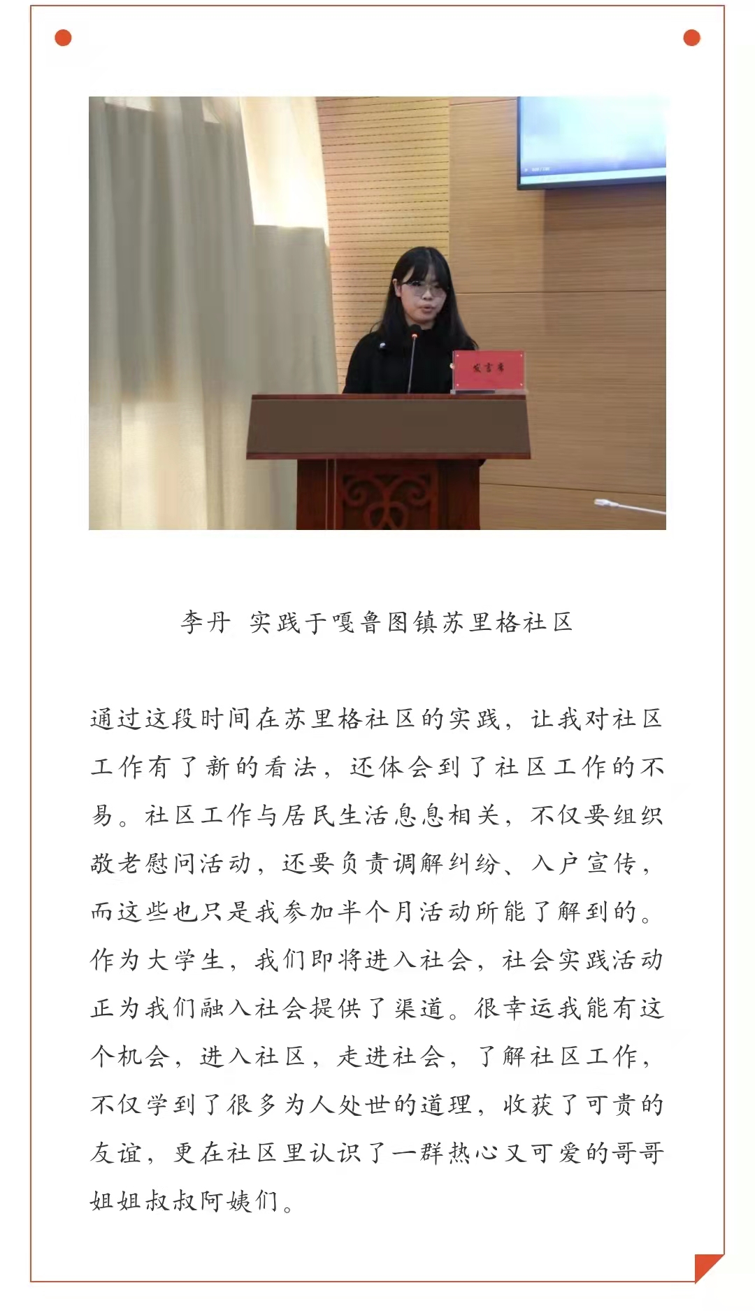 无法学到的知识。李丹同学想这将成为她人生中一笔宝贵的财富,进入社区,走进社会,了解社区工作,不仅学到了很多为人处世的道理,收获了可贵的友谊,更在社区里认识了一群热心又可爱的哥哥姐姐叔叔阿姨们。