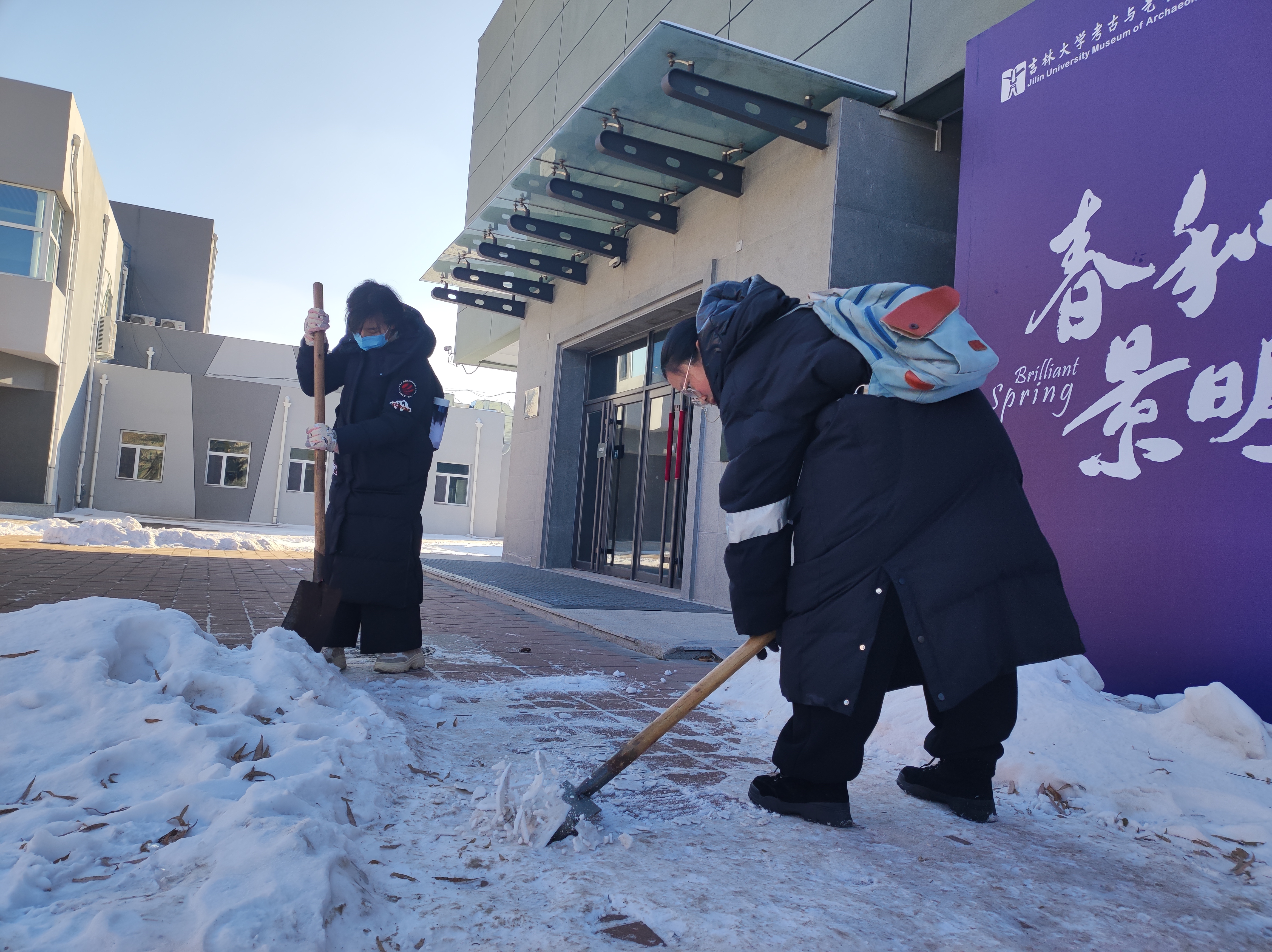 12点30分左右,田思昱、付楚淇、刘殷佚、杨柳和王清扬五位同学集合在考古与艺术博物馆前,在张馨予同学的带领下,大家不畏严寒,积极投身到扫雪除冰行动中。所有人都挥舞着铁锹和刀铲,有的铲、有的推、有的砸,齐心协力,分工明确,配合默契,干得热火朝天,忙碌的身影构成了一道靓丽的风景线。在劳动过程中,寒意逼人、人心却暖,大家劳动的热情和团结的力量显而易见,笑容洋溢在每位同学红彤彤的脸上。经过一个多小时的共同努力,原先的积雪冰冻被扫除,一条可供行走的安全道路被清理出来。