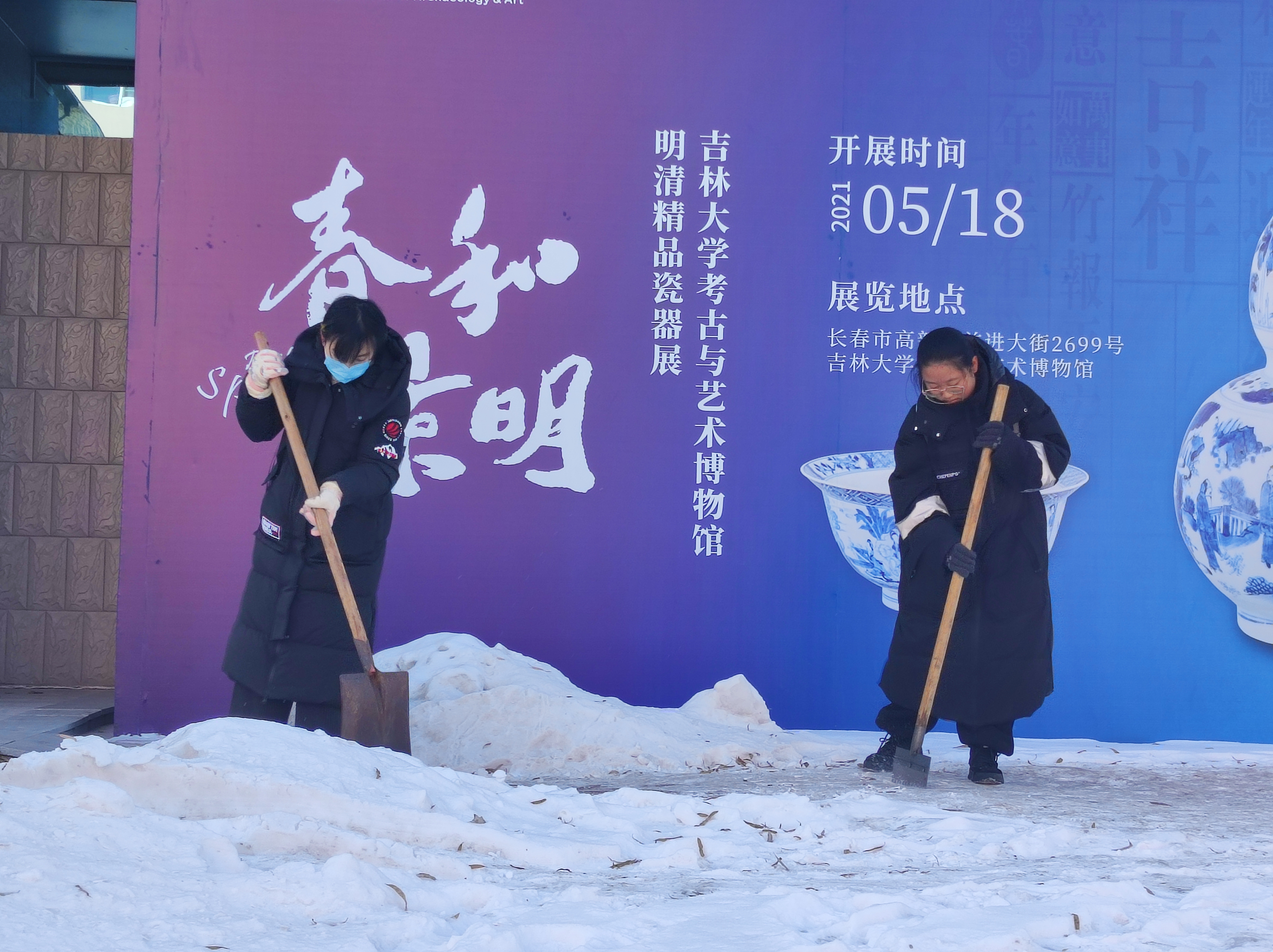 学生会组织了部分成员在考古与艺术博物馆前开展了扫雪除冰活动。
