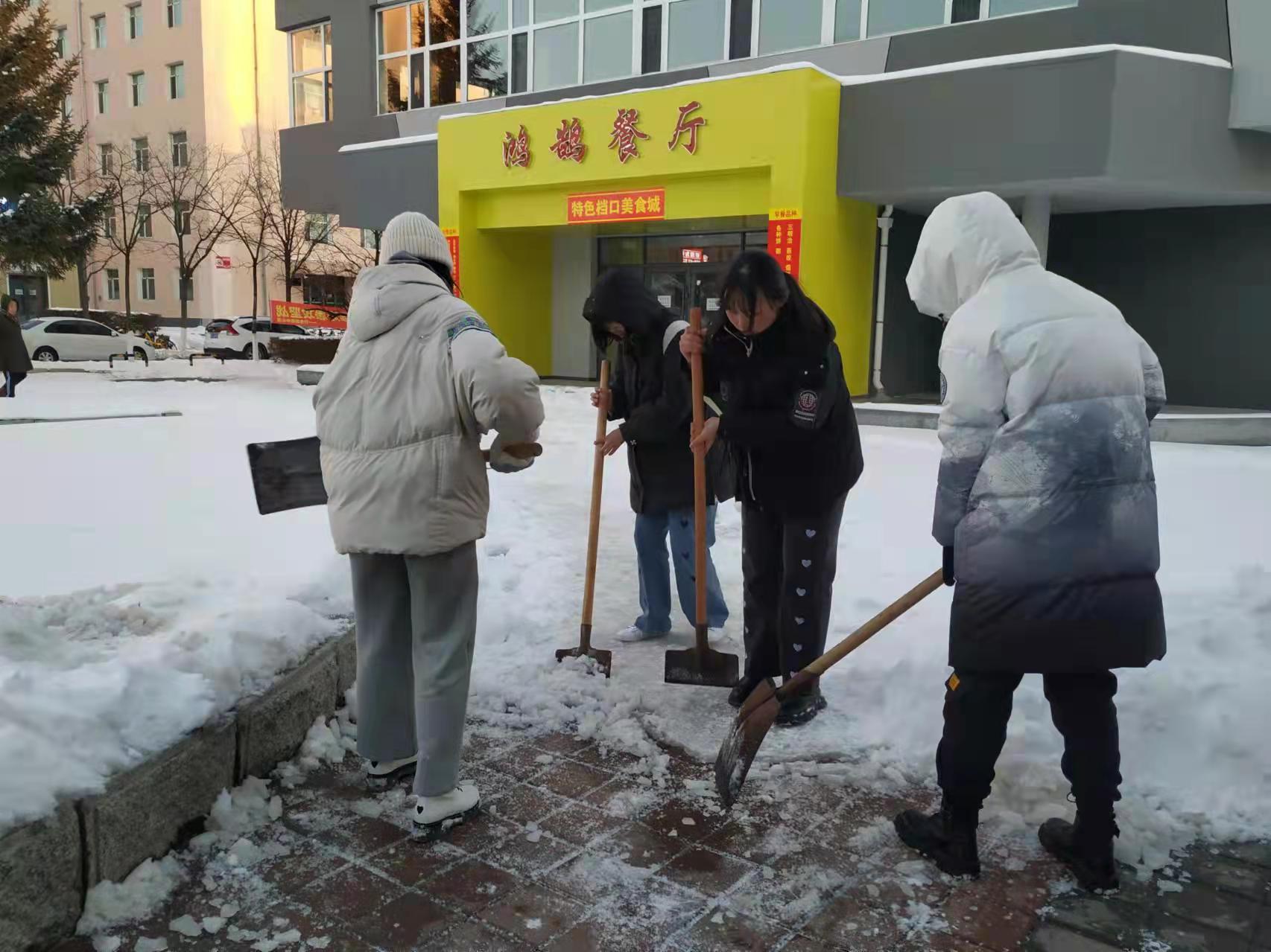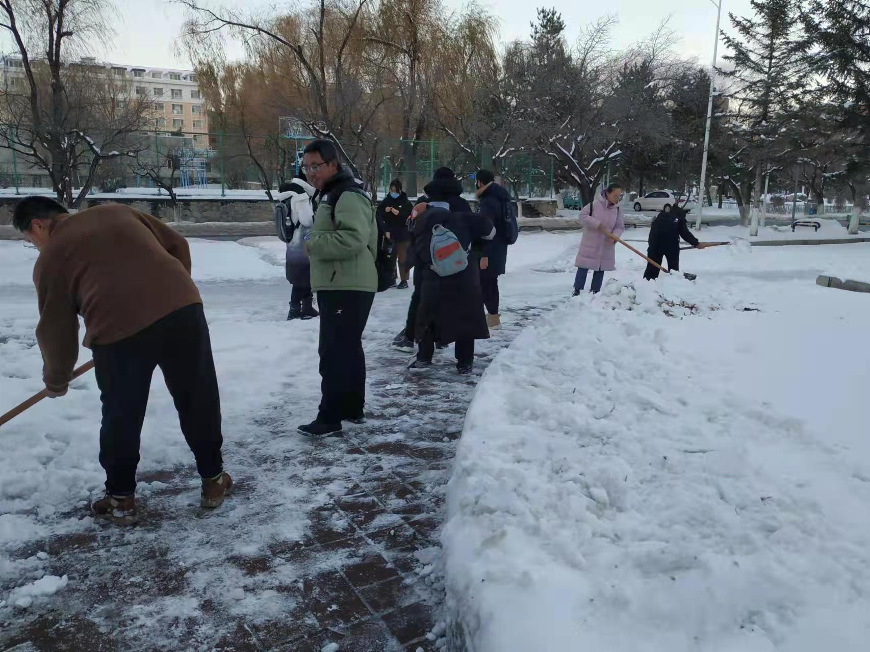 冰坚雪滑,清扫不易,然而亦有颇多乐趣。尽管忙碌了一会后同学们胳膊酸痛,身上也出了汗,但大家仍继续挥舞铁锹,用力铲起厚厚的积雪抛到路旁,破开顽固的坚冰推到一侧……大家同心协力,一起劳动,互相鼓励,乐在其中。清扫积雪的身影,成为冬日校园里一道靓丽的风景线。