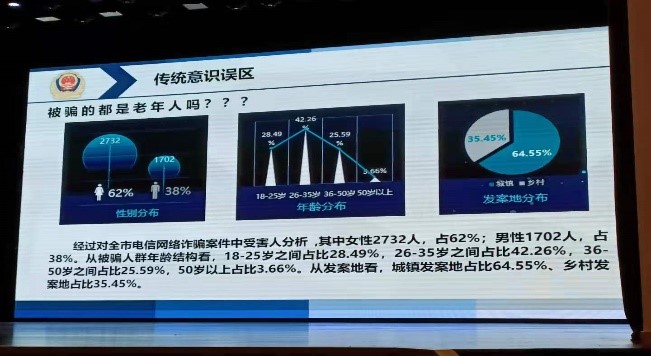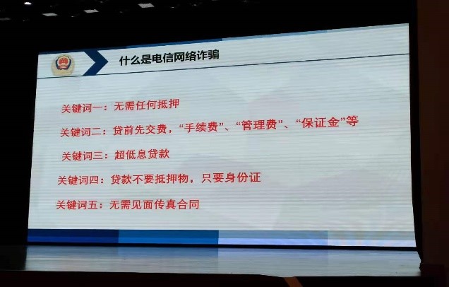 讲座中,高如月警官首先纠正了传统的认识误区——被骗人群不都是老年人,反到是中青年人占大多数,每个人都有可能成为被骗对象,让同学们对此次讲座有了高度的关注。随后她向大家展示了诈骗分子的工作场所,抓捕现场,诈骗分子的诈骗话术以及洗钱手段、倒卖银行卡等图片,为我们揭露了诈骗的真相,强化了大家的反诈防诈意识。在对不同类型电信诈骗案件的讲解环节,高警官结合自己的办案经历,详细介绍了网络刷单、网络贷款、套路贷、校园贷,以及针对年轻女孩的佳丽贷、医美贷、裸贷等电信诈骗类型,让同学们对新型诈骗方式有了更全面的了解。最后,高警官介绍了预防典型诈骗的守则和相关举报渠道,提醒学生要对来源不明的信息反复核实,多次确认,了解身边的不安全因素,提高安全防范意识,谨防上当受骗。