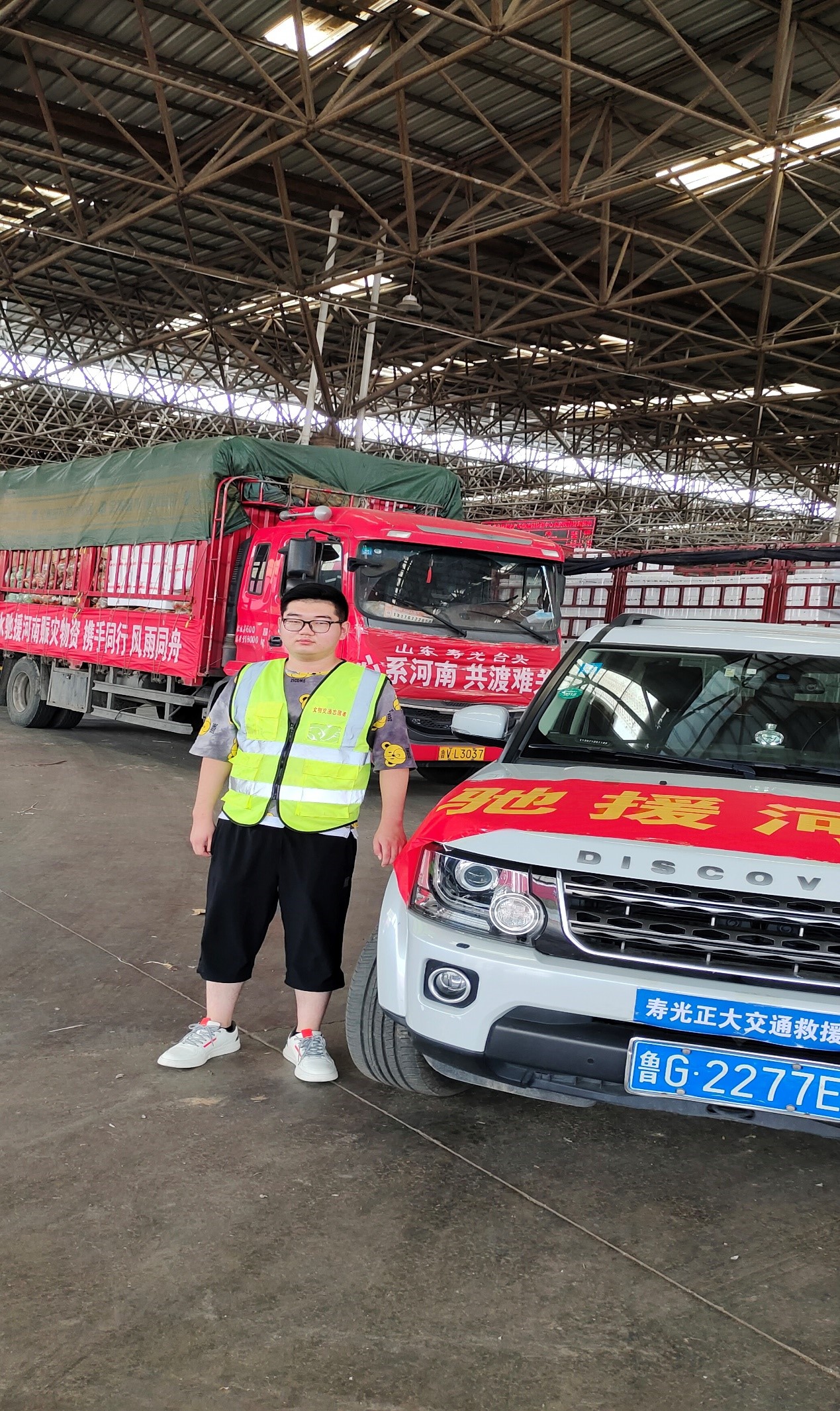 平宗同学的父亲作为寿光公益组织的一员,与同事一起筹备了四车蔬菜捐赠往河南新乡,借助这个机会,他随同父亲一起前往新乡。7月26日下午,五十吨的蔬菜在寿光公益组织志愿者的帮助下经过四小时搬运,装备货车,四辆大型货车装载完成后出发前往河南新乡,六小时车程后抵达目的地。第二天一大早,在当地政府的对接下,他们将四车蔬菜搬运卸下,虽然身体非常劳累,但是能够帮助受灾群众,尽到自己的绵薄之力,这会令人感到无比的幸福与自豪。