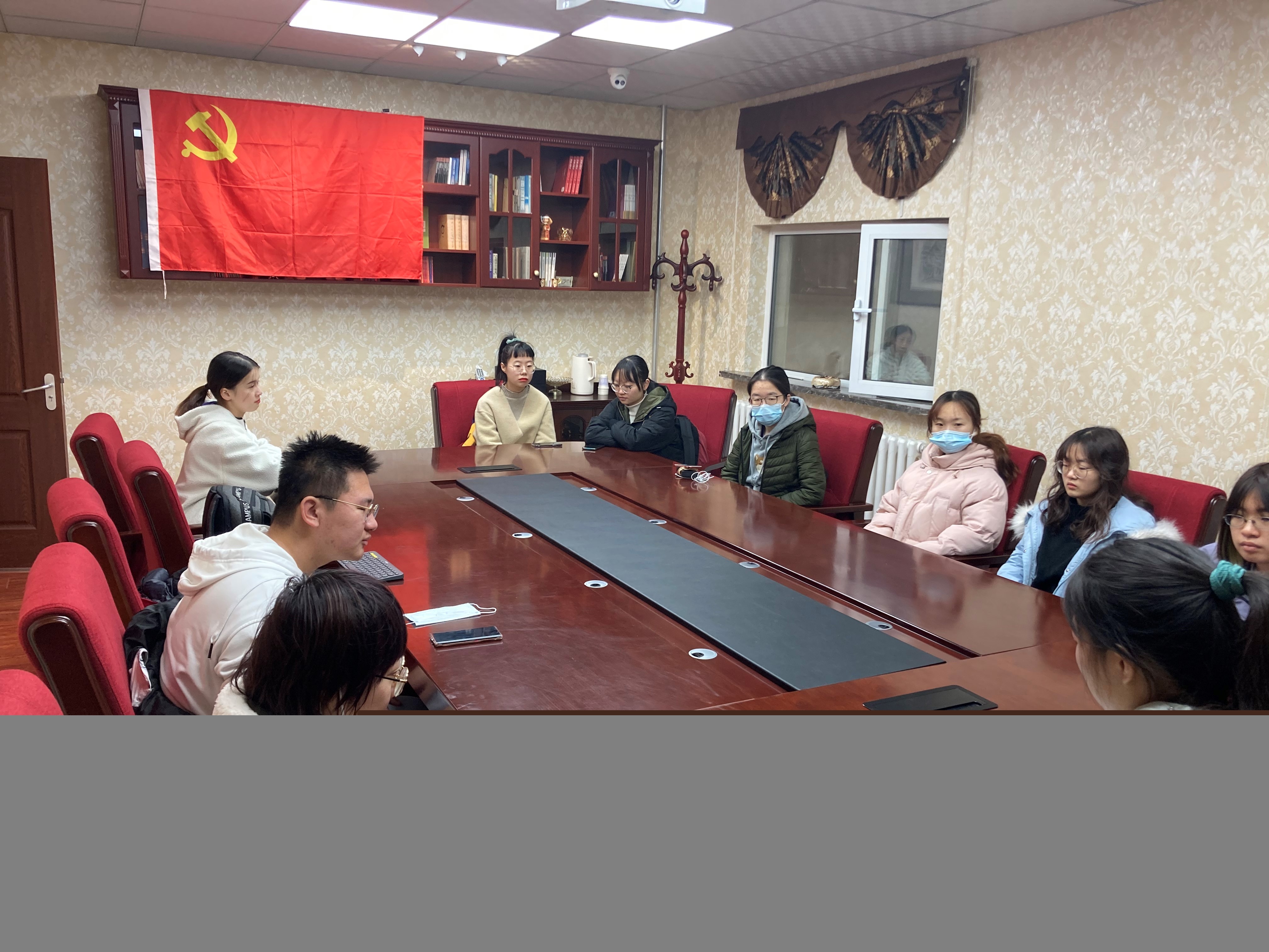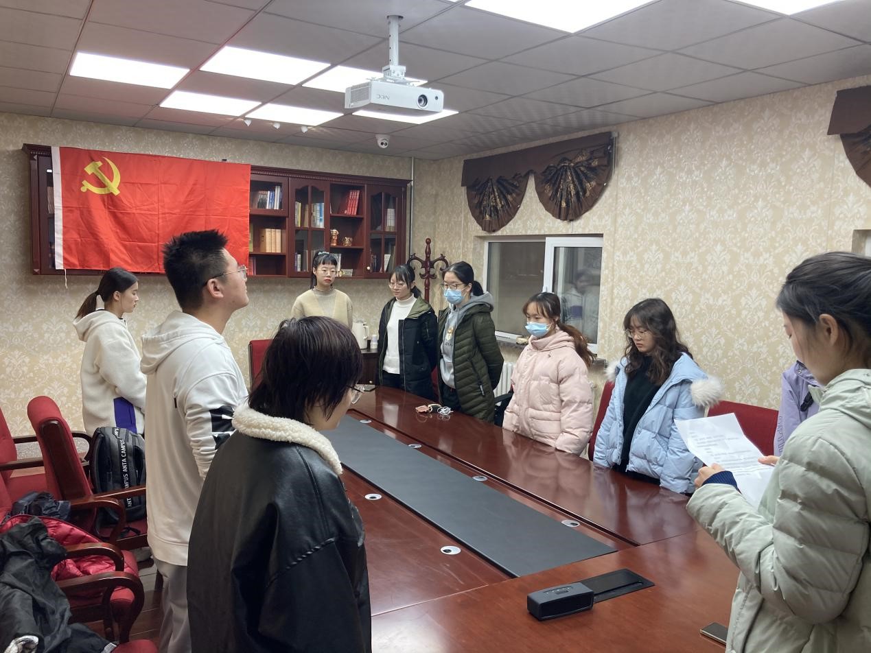 之后,开始播放国际歌,全体党员起立,对党旗行注目礼,播放完毕后,李明轩同志代表全体转正党员宣读入党誓词。