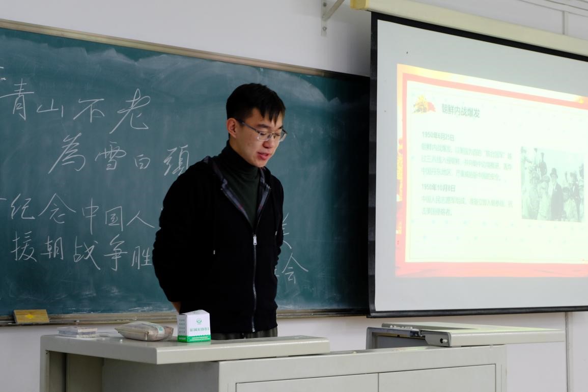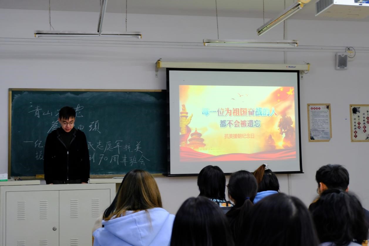 2019级本科生于经信教学楼D110教室开展了主题为“青山不老,为雪白头”纪念中国人民志愿军抗美援朝战争胜利70周年主题班会,班会的主要内容是观看抗美援朝专题纪录片《为了和平》,本次班会由温景超主持,极速飞艇