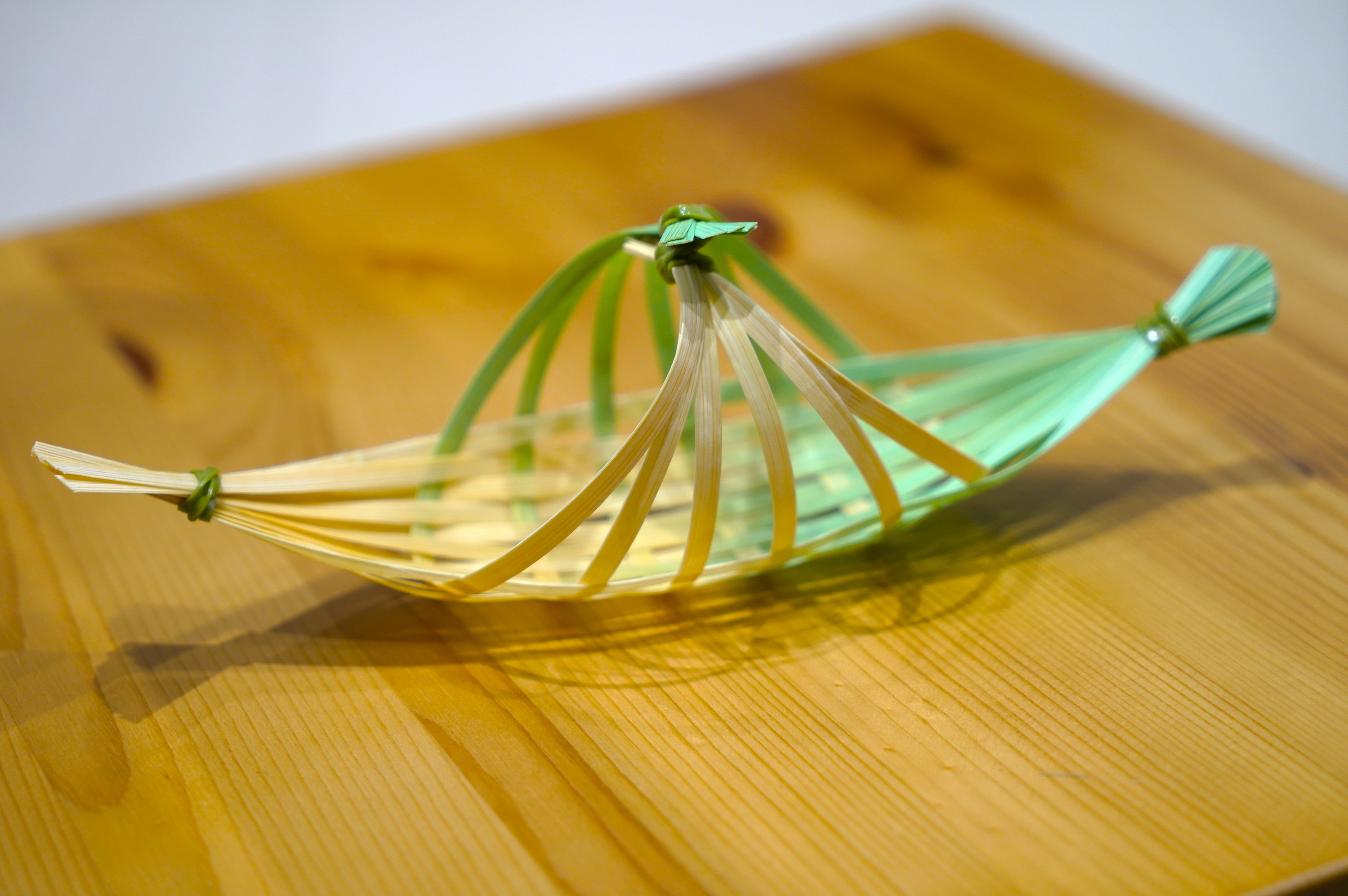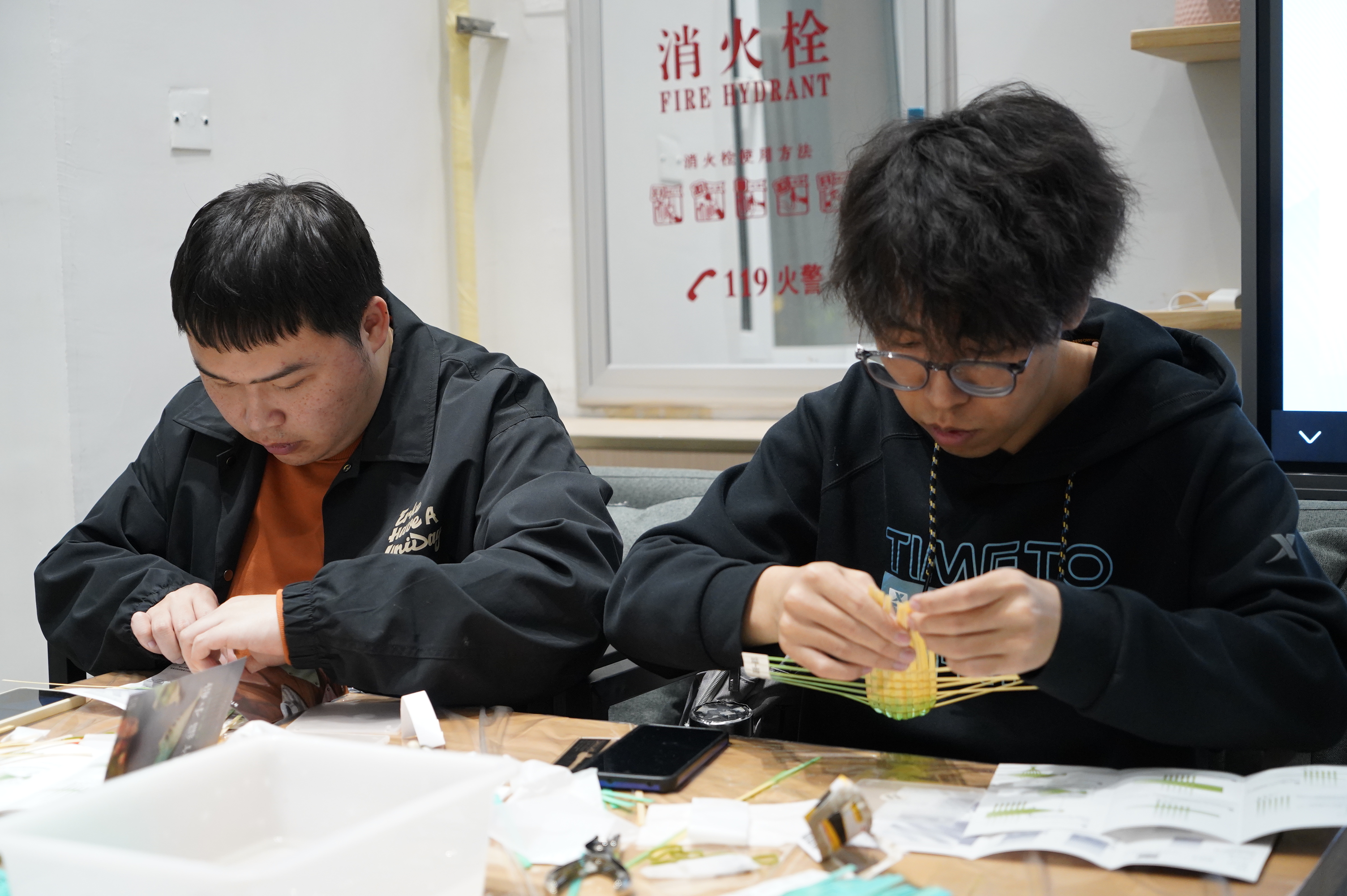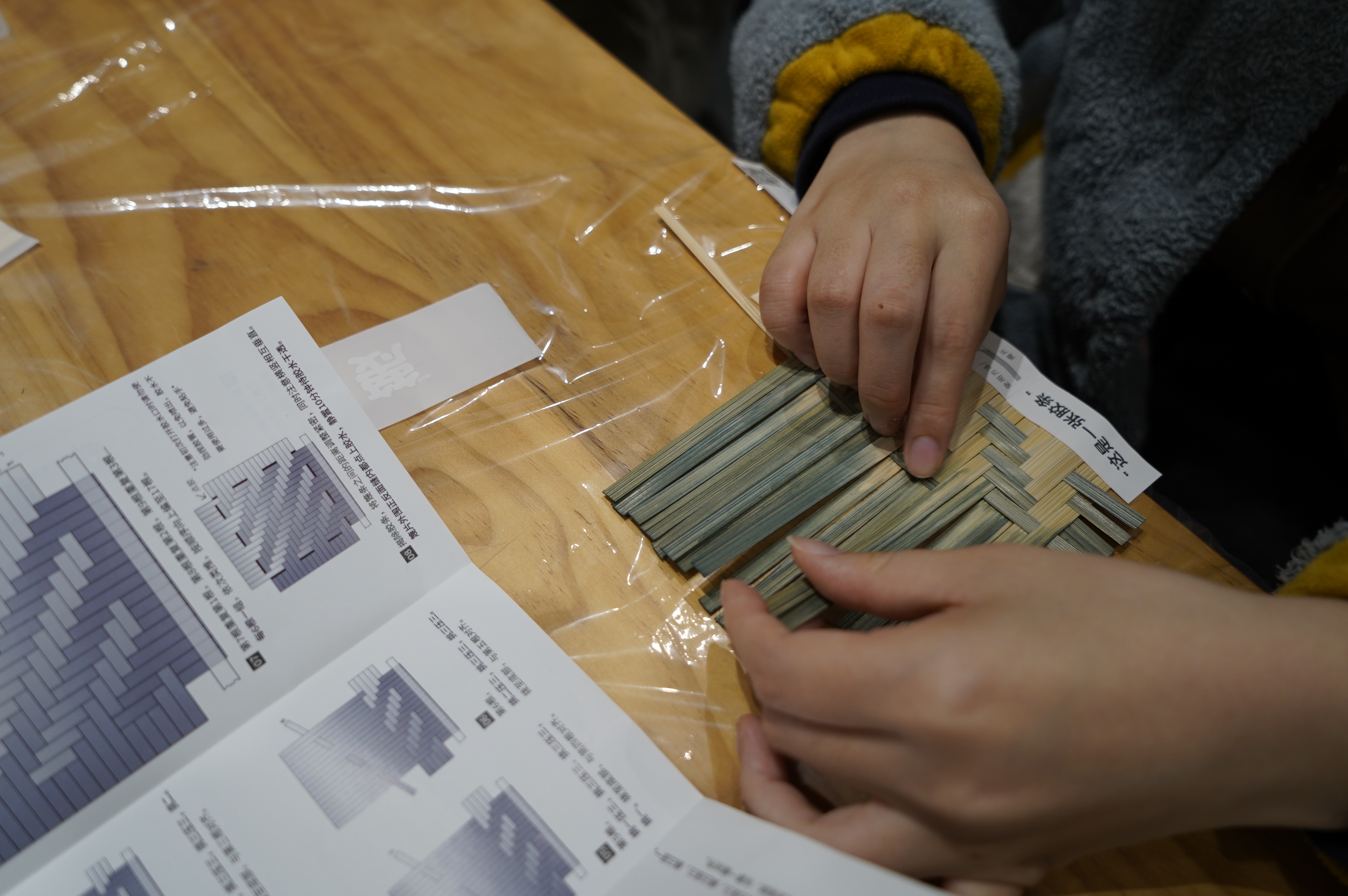 在制作体验环节,董欣悦向参与者介绍了制作过程中所需的材料及其用法,并结合图示对嵊州竹编技艺的步骤进行了细致的讲解,为参与者答疑解惑。