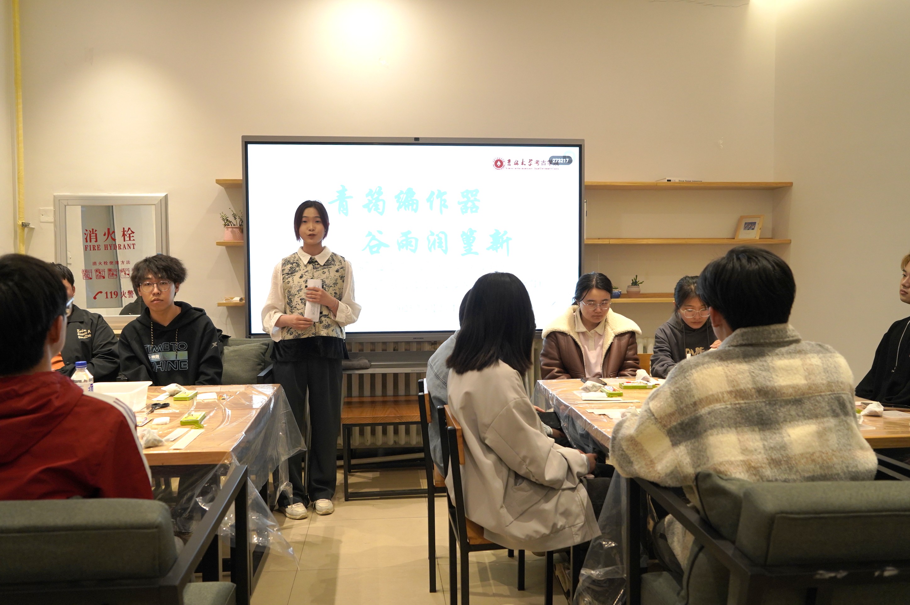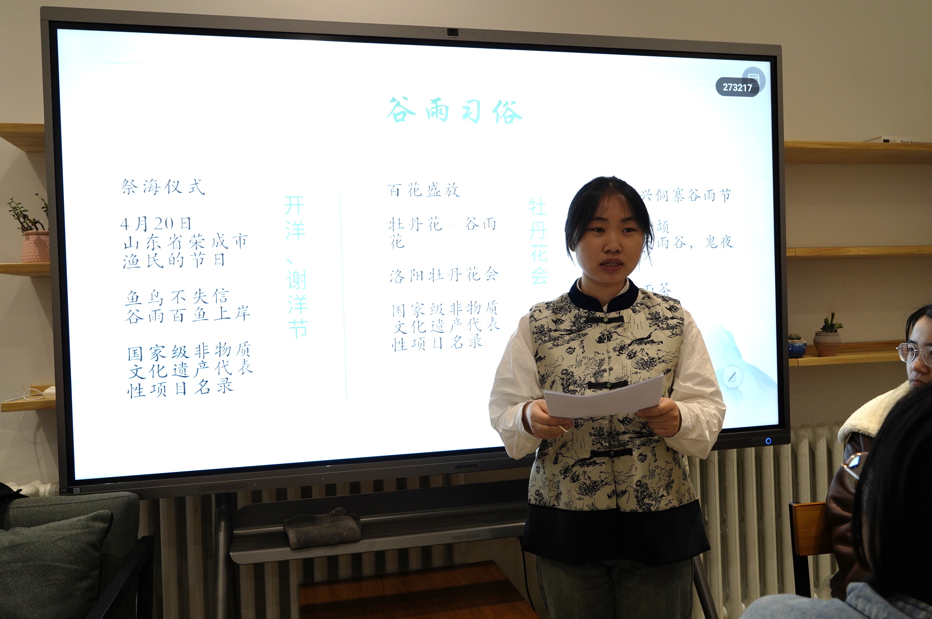 本科生董欣悦带领同学们走进万物生长的谷雨时节,以《诗经》和“谷雨三候”为切入点,展开了对国家级非物质文化遗产二十四节气之一——谷雨的知识科普,解读谷雨节气的文化内涵,介绍谷雨时的相关习俗,如播种养蚕、渔民开洋、举办花会和祭祀仓颉等。
