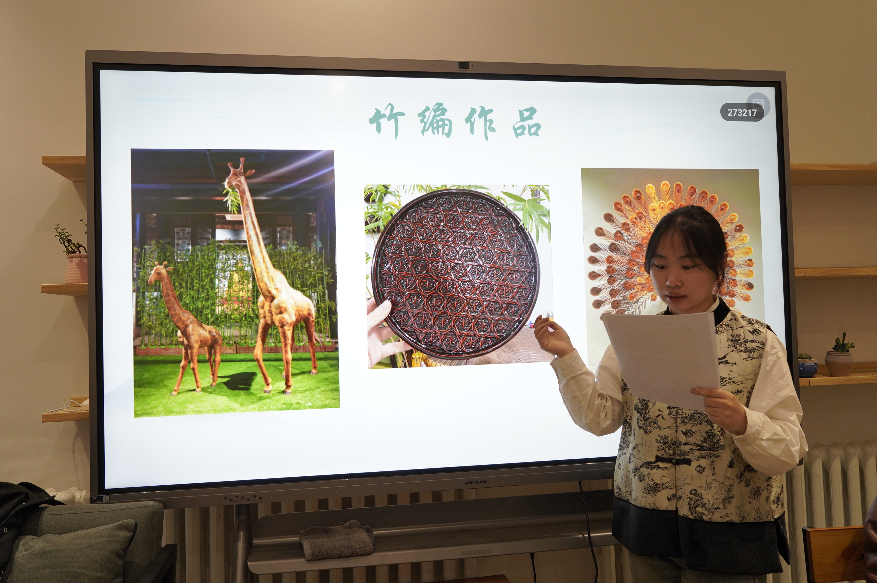 董欣悦为大家介绍了来自浙江省的国家级非物质文化遗产——嵊州竹编技艺。讲解图文并茂、绘声绘色,首先从整体上介绍了竹编技艺的发展脉络和其在当代的创新性发展,随后又特别讲述了嵊州竹编的传承历史。同学们认真倾听讲解、欣赏竹编作品,不仅深入了解了嵊州竹编技艺源远流长的发展历程、别具一格的工艺特色和复杂精巧的制作步骤,还体会到了嵊州竹编技艺在技艺传承、文化传递以及非遗保护等方面的重要意义。
